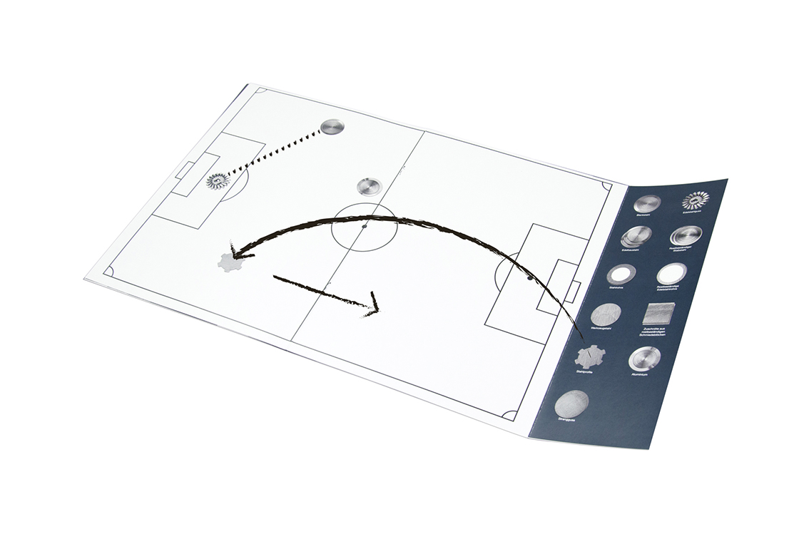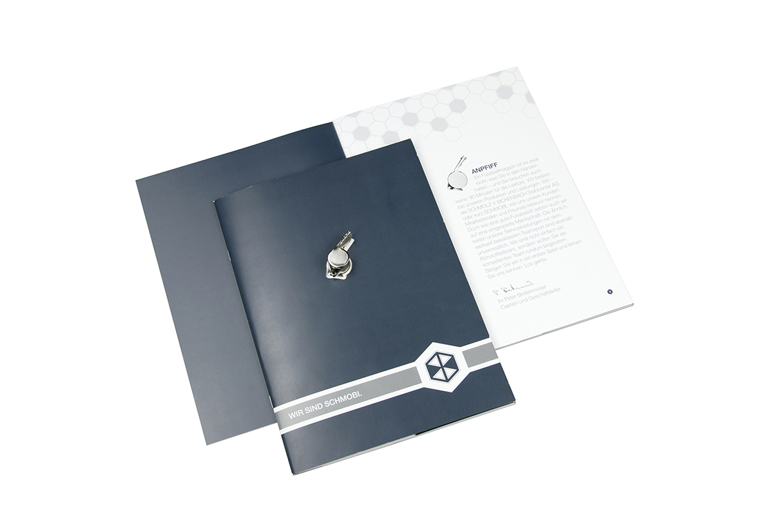 Der Teamgedanke wurde als schlagkräftiger und glaubwürdiger «reason why» in der gesamten Markenwelt in den Vordergrund gestellt. Bei der neuen Imagebroschüre wird sofort klar: SCHMOBI pfeift das Spiel mit dem Kunden an! Und dies wortwörtlich – die Frontseite der Broschüre ist mit einer Trillerpfeife ausgestattet. Wer weiterblättert merkt: Bei der Mannschaft rund um SCHMOBI gibt es keine «Bänkliwärmer» sondern nur Stürmer, die sich durch Individualität, Teamgeist und Fairness auszeichnen. Aber auch die riesige Produktauswahl des Unternehmens ist in der Broschüre vertreten und jederzeit einsatzbereit. Die Aufstellung des Liefersortiments verschiedener Stahlsorten und -formen kann der Kunde gleich selber auf dem Taktikboard aus Magnetpapier vornehmen. Für eine gute Zusammenarbeit lässt sich sogar ein Wimpel aus der Broschüre trennen.
