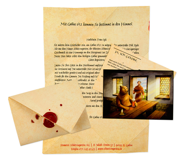 Mit Bronze wurde die mehrstufige Door-Opener-Kampagne für die sanktgaller Brauerei Schützengarten geehrt. Die Brauerei hat mit Gallus 612 ein einzigartiges Old Style Ale auf den Markt gebracht. Um das edle Braugetränk in gehobenen Gastronomiebetrieben, Pubs und Smokers Lounges auch überregional kredenzt werden. Für die Akquisition entwickelte die Agentur am Flughafen einen versiegelten Teaserbrief der die Gastronomen aufforderte Gallus 612 ins Sortiment aufzunehmen. In einem nächsten Schritt wurde eine in edles Leinen gefasste Bierbibel und eine zwischen den Buchdeckeln eingebettete Probierflasche Gallus 612 mit dazugehörigem Glas versandt.