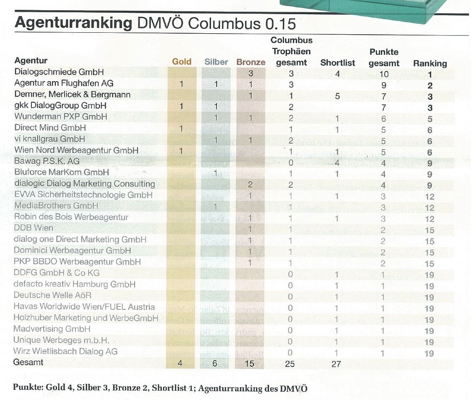 Am vergangenen Donnerstag verlieh der Dialog Marketing Verband Österreich (DMVÖ) in Wien die begehrten Columbus-Trophäen. Erstmals stösst mit der Agentur am Flughafen eine ausländische Agentur in die Top 3 des Dialogmarketing Rankings in Österreich vor. Neben der Agentur am Flughafen war mit Wirz Wietlisbach eine weitere Schweizer Agentur erfolgreich und platzierte sich im Ranking. Bei der diesjährigen Preisvergabe wurden die Kreativen aus Altenrhein gleich mit 3 Arbeiten ausgezeichnet:
