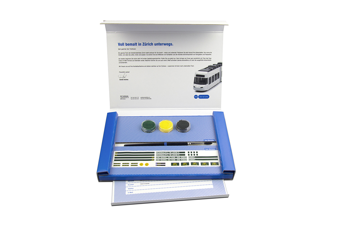 Die Cobra Trams in Zürich bieten die ideale Fläche um Marken und deren Botschaft grossräumig zu kommunizieren. Fünf Trams stehen zur Vollbemalung bereit. Um weitere Kampagnen auf die Trams zu bringen, hat die Agentur am Flughafen ein Door-Opener-Mailing für VBZ TrafficMedia – die internen Vermarkter der Werbeflächen – kreiert. Dabei wird ein eigens auf die Marken der Zielkunden individualisiertes Set mit Malfarben und Werbestickern versandt. Wünscht der Kunde einen Termin zur Beratung wird er mit einem schneeweissen Modeltram besucht. Der Kunde kann somit mit dem Gestaltungsset gleich mal ausprobieren wie die Fahrgäste, Passanten und Passantinnen seinen Brand auf den Trams tagtäglich in der Limmatstadt wahrnehmen.