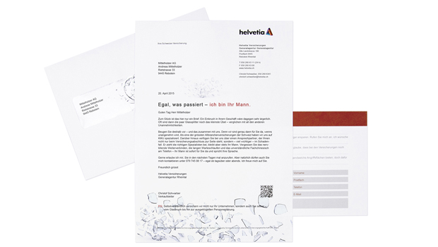 Egal, ob zu Hause oder im Geschäft, wenn man von Einbrechern heimgesucht wird, ist es äusserst unangenehm. Um Langfingern ein Schnippchen zu schlagen, wollte die Helvetia Versicherungen mit einem Türöffner-Mailing bei potenziellen B2B-Neukunden für das Thema sensibilisieren und aufgrund ihrer umfassenden Dienstleistungen versuchen einen Termin zu kriegen. Die Agentur am Flughafen konzipierte ein nicht kriminelles Door-Opener-Mailing. Doch ganz ohne Einbruch gings nicht, war doch beim Fenstercouvert, das Fenster bereits eingeschlagen. Öffneten der Empfänger das Kuvert, fand er darin einen mit Glassplittern versetzten Brief, der dazu aufforderte, sich von Helvetia Versicherungen schon mal präventiv beraten zu lassen.