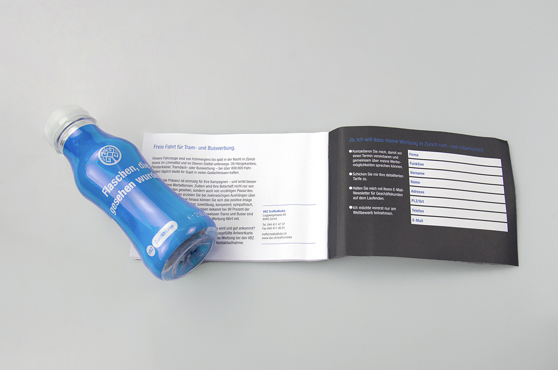 Einmal jährlich ruft VBZ TrafficMedia bei lokalen Medienentscheidern die Werbemöglichkeiten auf Trams und Bussen in der Limmatstadt in Erinnerung. Diesmal basierte das Mailing auf einer kürzlich durch die VBZ durchgeführten Werbewirkungsstudie für das neue Lifestyle-Getränk Yotoco. So ernannten die Kreativen aus Altenrhein das Produkt auch gleich zum Helden und verschickten unverpackte, direktadressierte und VBZ-blau bedruckte Flaschen des neuen Drinks. Darin fanden die Empfänger das komplette Studien-Booklet, das beweist, wie erfolgreich Bus- und Tramdachwerbung auch bei der Neueinführung von Produkten und selbst mit kleinem Budget sein kann.