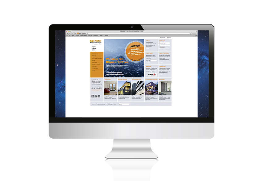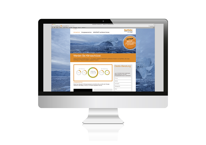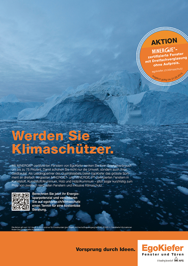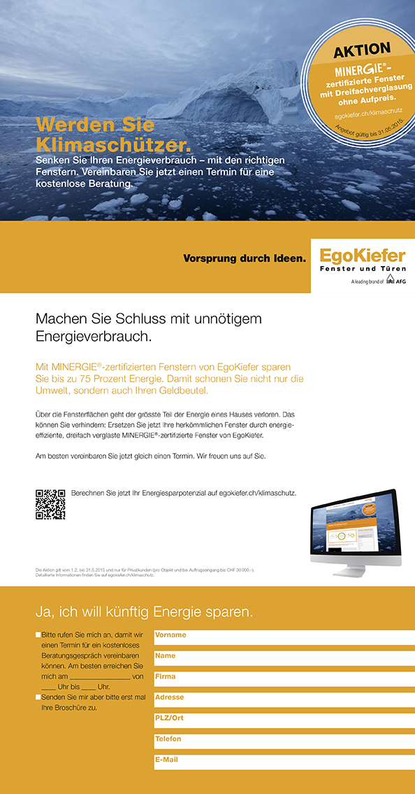Im Zentrum der Aktion stand ein Angebot für MINERGIE®-zertifizierte Fenster mit Dreifachverglasung ohne Aufpreis. Dies wird mit Plakaten, Inseraten, Webbannern sowie Direct-Mailings bei Hausbesitzern und Hausbauern beworben – mit Einbindung von EgoKiefer Fachbetriebspartnern. Die eigens konzipierte Microsite egokiefer.ch/klimaschutz zeigt den Interessenten mit dem implementierten Energiesparrechner gleich auf, wie viel Energie und Geld sich mit MINERGIE@-Fenstern von EgoKiefer sparen lässt.
