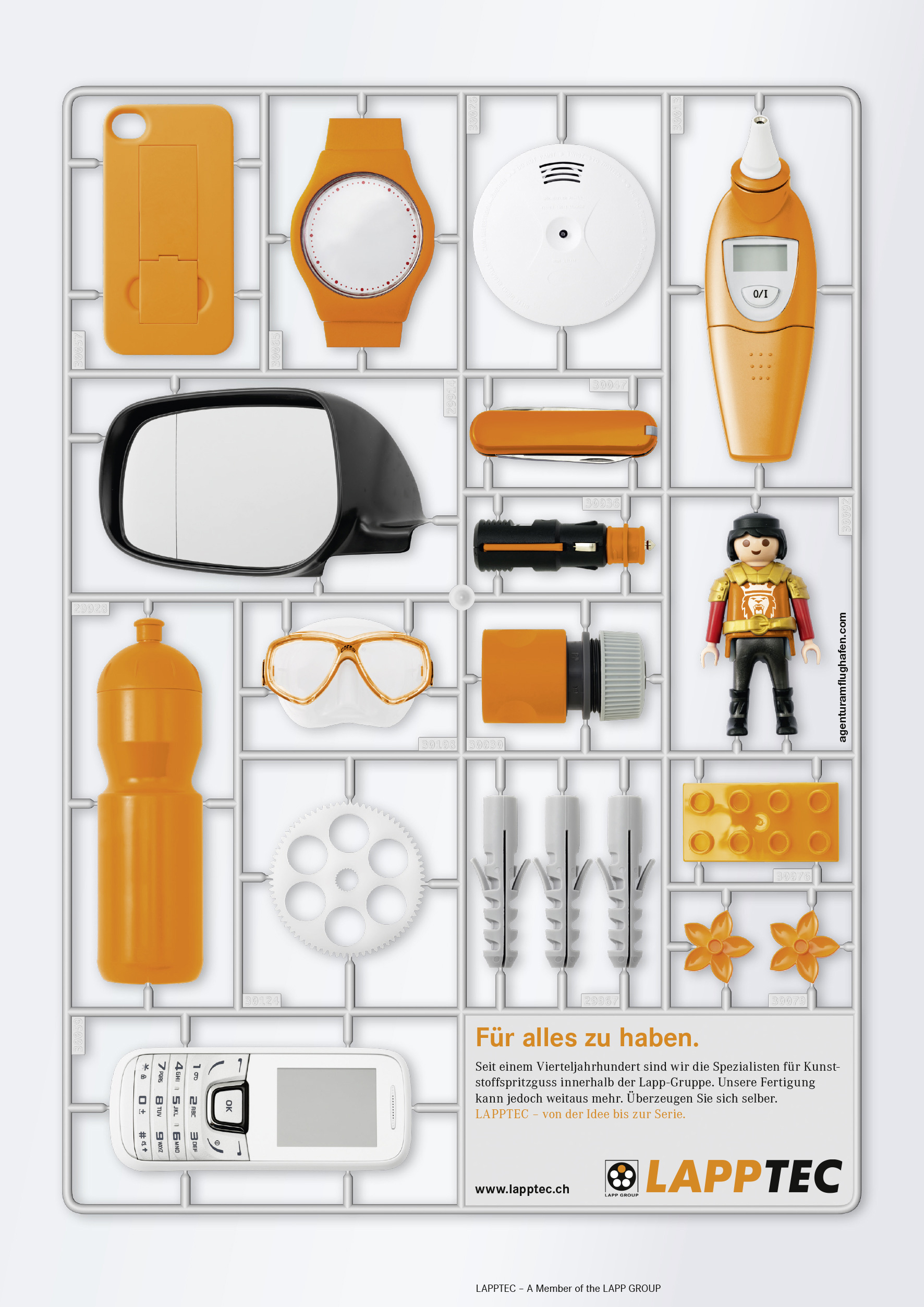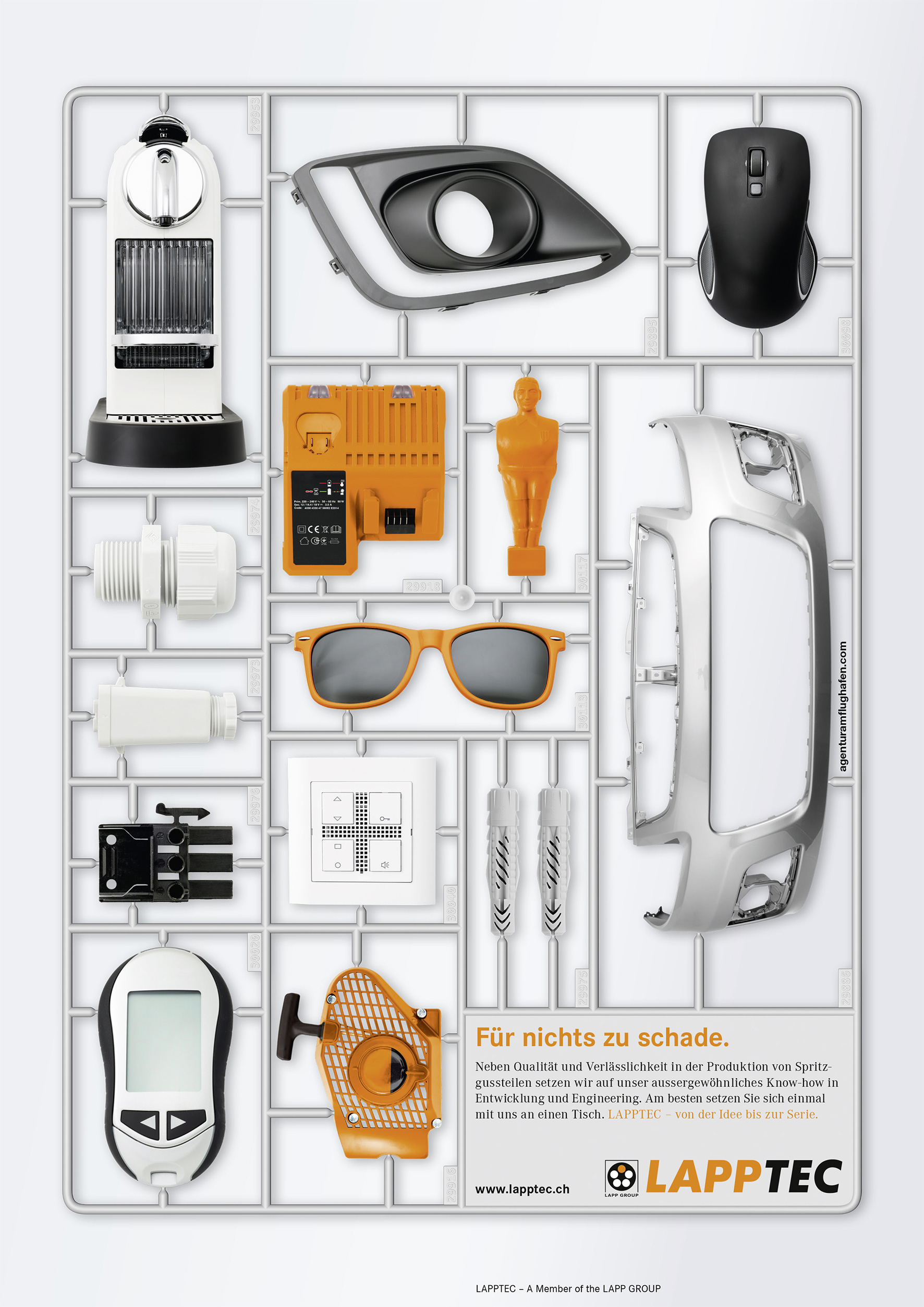 Der Kunststoffspritzgussproduzent LappTec ist die Schweizer Tochtergesellschaft der Deutschen Lapp Group, dem weltweit agierenden Marktführer im Bereich Kabeltechnologie. Nach einer strategischen Neuausrichtung des Schweizer Ablegers sollen in Zukunft auch Kunden ausserhalb der Lapp Group gewonnen werden. LappTec soll dabei als Produzent vielfältigster Spritzgussteile positioniert werden. Das Unternehmen bietet Dienstleistungen von der Entwicklung bis hin zur Serienfertigung. Dieses Know-how sowie die Fertigungsbreite und -tiefe wurde von der Agentur am Flughafen in einer B2B-Inseratekampagne unter Beweis gestellt.