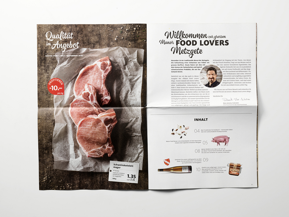 Das Herzstück der Kommunikation ist das MANOR FOOD LOVERS MAG, welches als Beilage alle 14 Tage in der Sonntags- und Tagespresse erscheint. In allen drei Sprachregionen. Das Heft im Spezialformat 255 x 380 cm feiert auf zwölf Seiten Genuss und Qualität im Angebot. Und stützt sich hierbei auf die Grundpfeiler von MANOR FOOD, mit dem Anspruch superbe Essenserlebnisse für jeden Tag zu bieten.