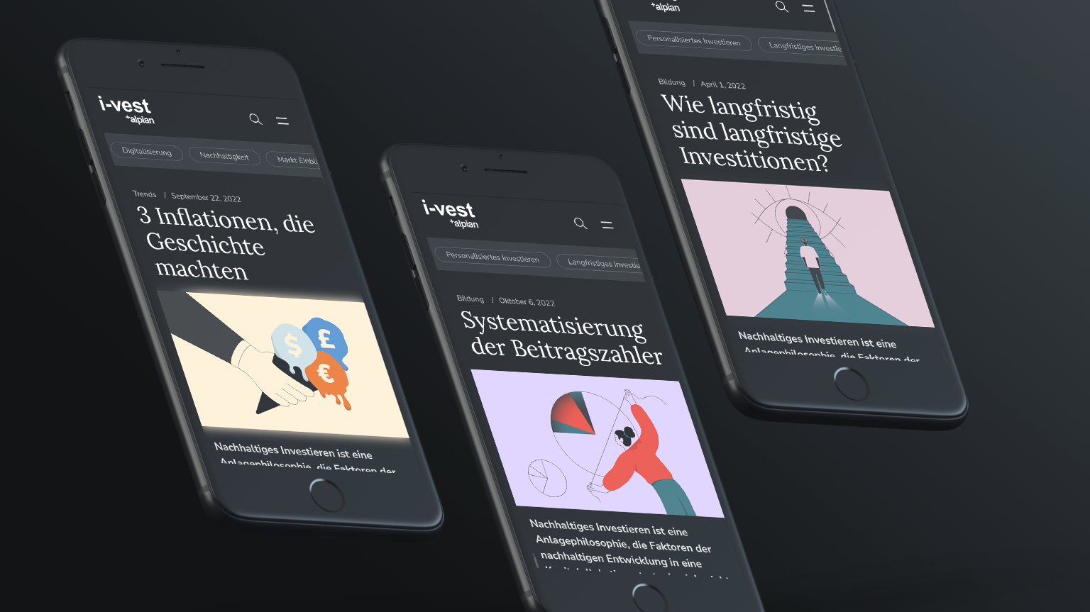 Die partnerschaftliche Denkweise hat dazu geführt, proaktiv für die Marke zu denken. Nur wenige Monate nach Beginn der Zusammenarbeit wurde der Aufbau einer Content-Plattform angepackt. Das Ergebnis ist i-vest.ch, eine unabhängige Plattform für Finanzinhalte und persönliche Werte, die weit über das liebe Geld hinausgehen. Auf der Plattform finden sich über 300 Inhalte die inspirieren, Interviews über ganz persönliche Werte und das Thema Wohlstand. Mit Gästen wie dem Oscar-nominierten Animator Simon Otto, dem erfolgreichen Schweizer Filmemacher Oliver Rihs und Alpian’s Chief Inspiration Officer, Belinda Bencic und Géraldine Fasnacht.