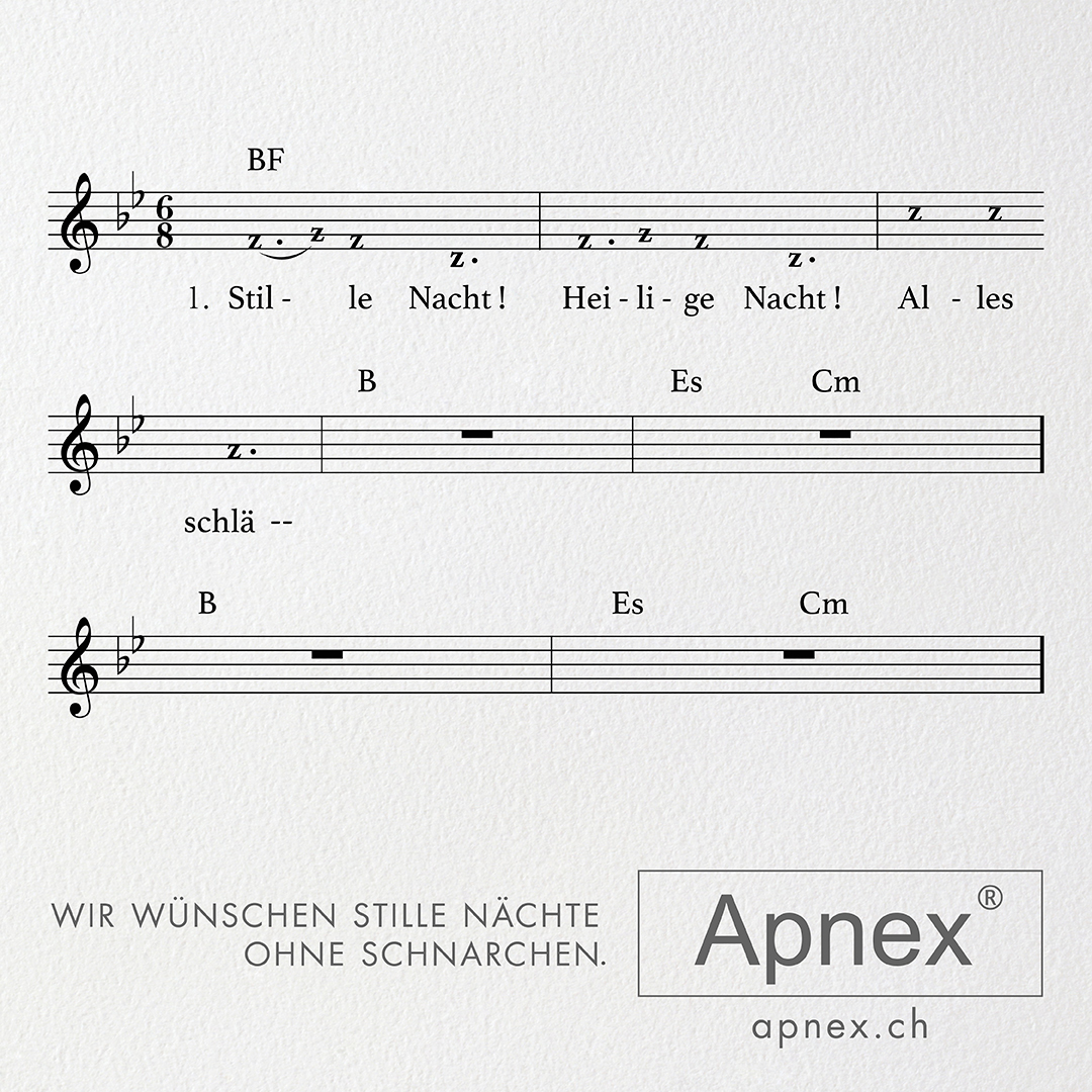 Eins der grossen, ungelösten Probleme bei Paaren ist das Schnarchen. Das laute Sägen bewirkt, dass Menschen unausgeschlafen zur Arbeit gehen, dass getrennte Schlafzimmer bezogen werden, dass die Liebe verblasst. Darum weist die Firma Apnex mit einer hübschen kleinen Anzeige fürs Fest der Liebe auf Geschenke hin, die wieder stille Nächte erzeugen.