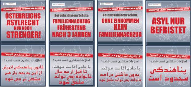 Auch wenn das Elend in Ländern wie zum Beispiel Afghanistan gross ist, gibt es dort trotzdem ganz normale Werbung mit Inseraten, Plakaten und TV-Spots. Und über diese Kanäle will das Innenministerium im Wien nun Migrationswillige von ihrer Flucht nach Österreich abhalten. „Schlepper lügen“, heisst der Claim bei einer Serie von Plakaten, die in Afghanistan inzwischen in grossen Formaten entlang der stark befahrenen Strassen aufgehängt sind. Die übersetzten Headlines in grossen roten Buchstaben lauten: „Ohne Einkommen kein Familiennachzug“, „Asyl nur befristet“ oder „Familiennachzug frühestens nach 3 Jahren“. Dazu gibt es weiterführende Texte wie: „Schlepper lügen! Informieren Sie sich! Bei wirtschaftlichen Gründen gibt es kein Asyl in Österreich.“