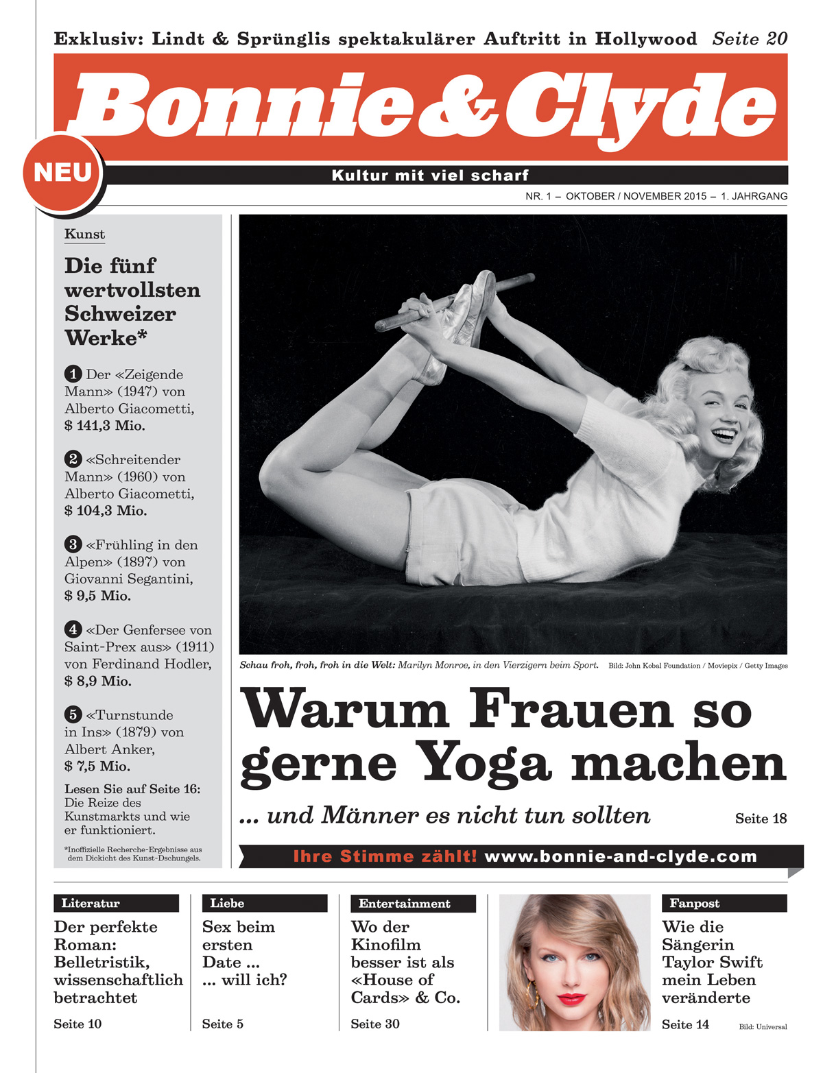 Im Heft geht es darum, ein breites, Kultur-affines Publikum anzusprechen. Ganz wichtig für «Bonnie & Clyde» ist, dass die Themen aus einer besonderen, überraschenden, provokativen oder humorvollen Sicht behandelt werden. Nur so wird sich die Zeitschrift behaupten können. Auch ist «Bonnie & Clyde» keiner Szene verpflichtet. In der ersten Nummer erfährt man zum Beispiel, wo die gefeierten TV-Serien an ihre Grenzen stossen und wo ihnen der Kinofilm überlegen ist, weshalb Frauen so gerne Yoga machen und Männer es nicht tun sollten, wann man in der Oper «Brava» und nicht «Bravo» rufen soll, wie der Schweizer Kunstmarkt funktioniert oder, ob es so etwas wie einen meditativen Orgasmus gibt. Diese Spannbreite bedeutet für mich Kultur mit viel scharf. Zudem hatte ich das Privileg, in dieser ersten Ausgabe mit einigen der renommiertesten Journalisten im Land und zugleich mit jungen hervorragenden Autorinnen und Autoren zusammenzuarbeiten.