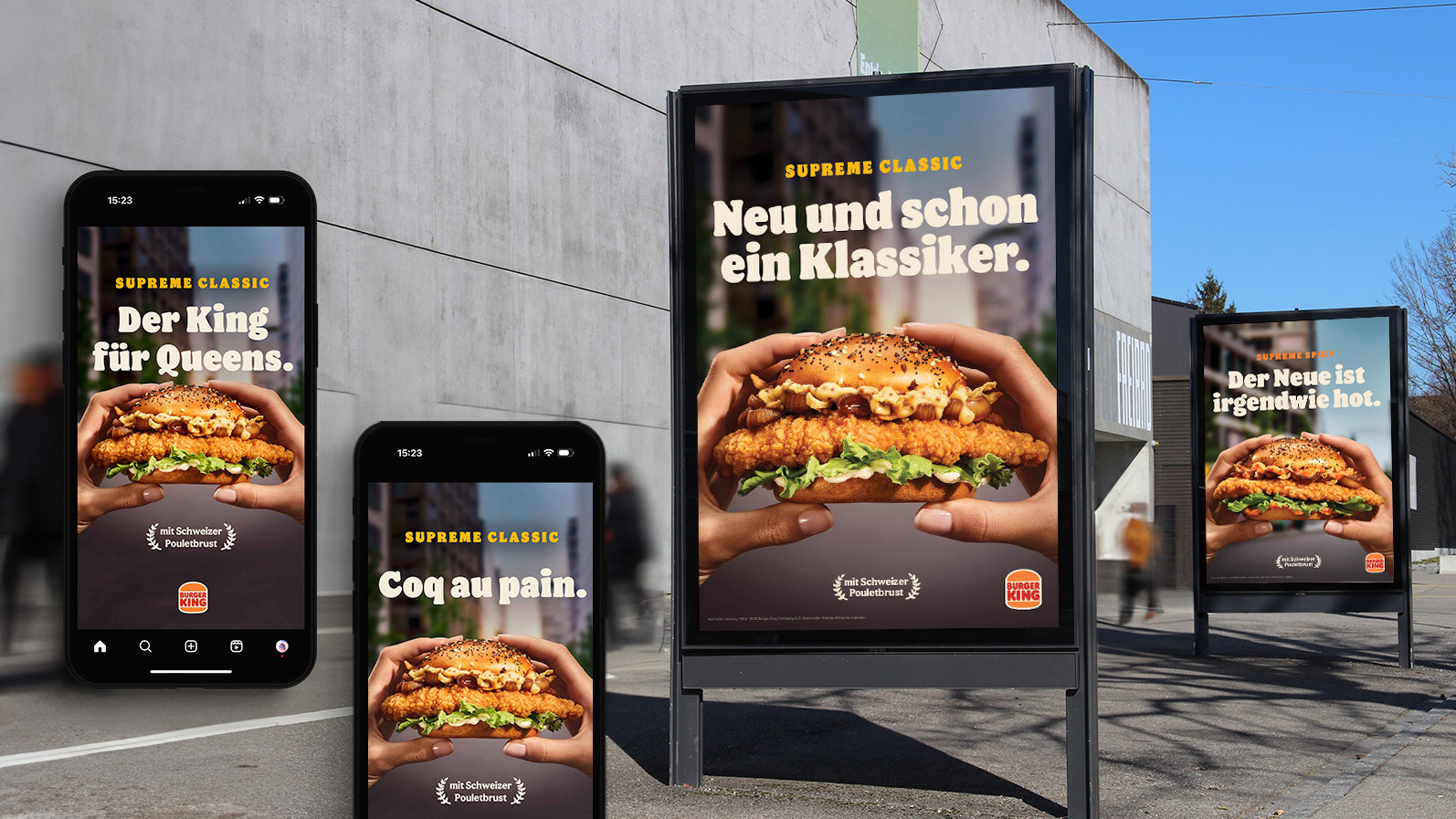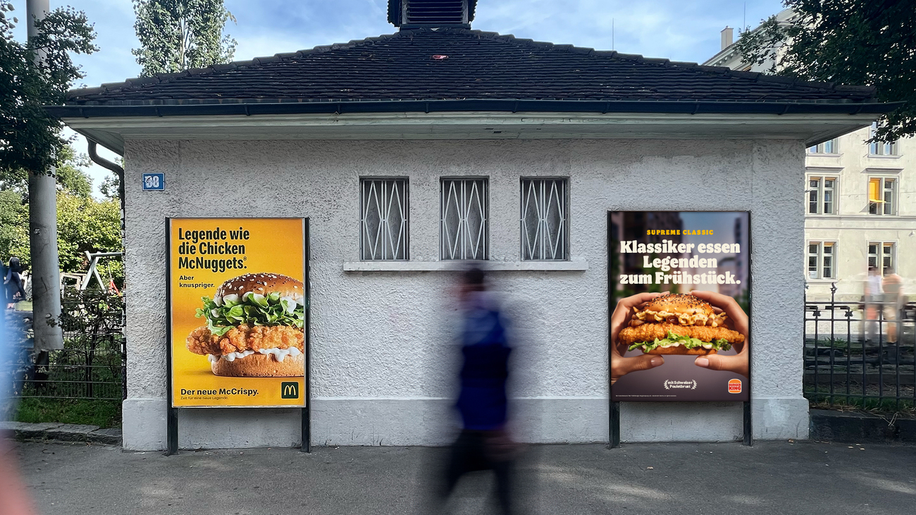 OOH wird das Geschmacksduell mit unterschiedlichen Headlines ausgetragen. Während der Supreme Spicy der Neue ist, der irgendwie hot ist, ist der Supreme Classic der Neue, der schon jetzt ein Klassiker ist. Oder ganz einfach: Zwei Burger, von denen einer besser ist – die aber ganz sicher beide aus Schweizer Pouletbrust hergestellt werden.