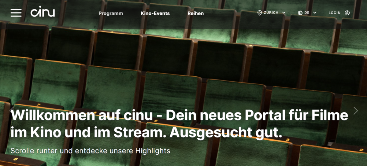 Mit zwei Silben bringt der Name «cinu» auf den Punkt, was die Plattform bietet: cineastische Freuden ohne Umwege, im Nu sind Tickets für den nächsten Kinobesuch zu lösen und gute Filme im Stream zu finden – einfach, schnell und von überall.