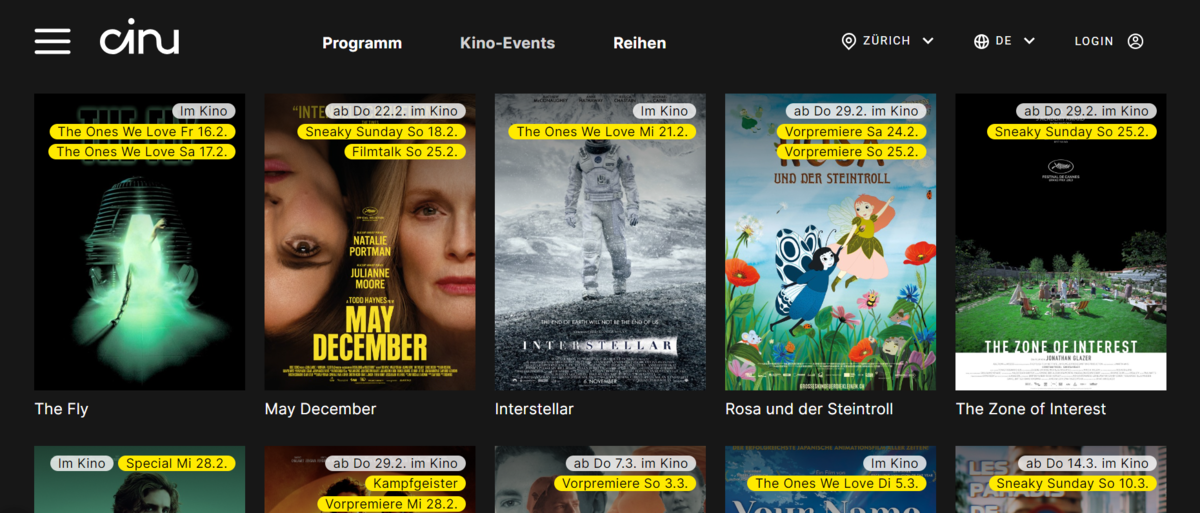 Wer cinu.ch nutzt, bewegt sich einfacher durch das laufende Filmangebot und findet anhand seiner Vorlieben und Wünsche den richtigen Film einfacher. Die differenzierten Filterfunktionen ermöglichen individuell massgeschneiderte Filmerlebnisse – ob im Kino, unterwegs oder zuhause. Neben persönlichen Filmhighlights hält cinu.ch auch Entdeckungen bereit.
