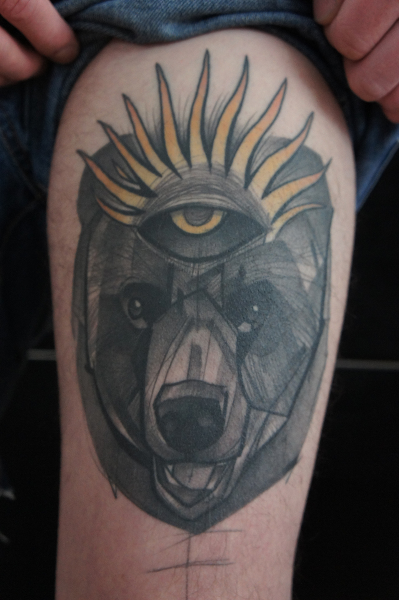 Den Bären liess ich mir an der diesjährigen Bodensee Convention stechen und zwar verfolge ich denjenigen Tätowierer schon seit längerem. Seine Arbeiten gefallen mir sehr und es war immer mein Wunsch eines Tages ein Stück mit seiner «Nadel» gestochen zu bekommen.