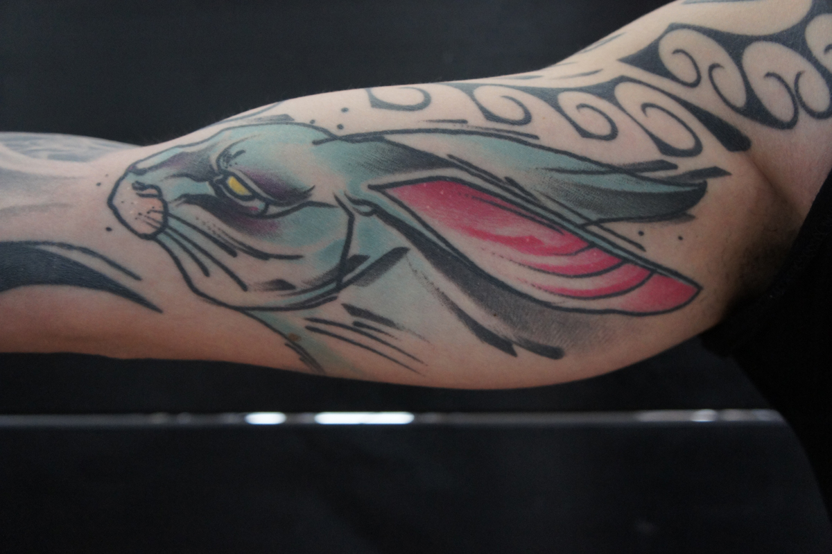 Mein Boris;-) Ich besitze selber Hasen und finde sie einfach super geile Tiere! Der Hase, der meinen Innenoberarm ziert, ist Boris, einer meiner Hasen! Als meine Frau und ich uns die Hasen anschafften, fiel uns Boris als Erster gleich auf. Es war Liebe auf den ersten Blick. Er war der einzige Hase, der knurren konnte, sehr nervös war und einen Schnurrbart hatte =) Das hat uns von Anfang an gefallen und wir entschieden uns für ihn. Die Wahl war nicht sonderlich schwer!