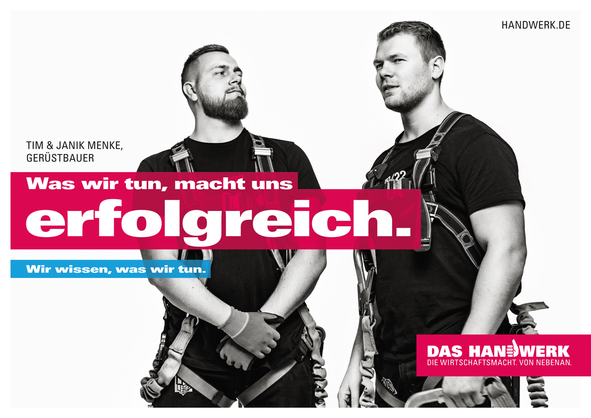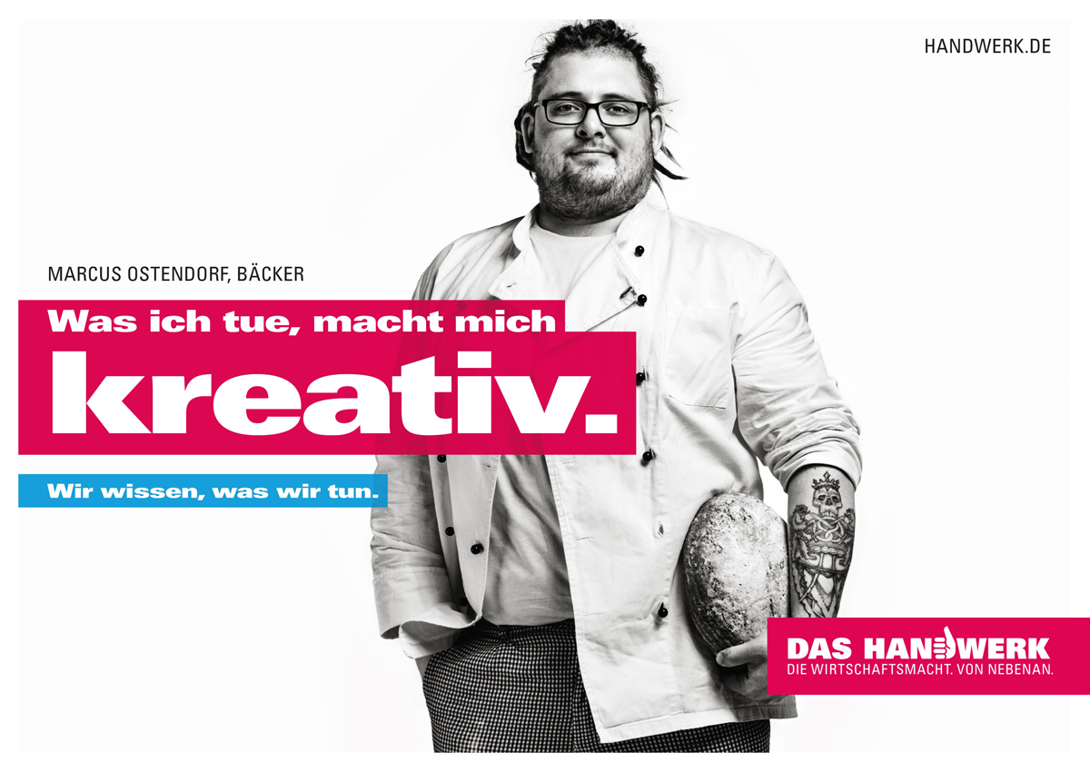 Auch in der dritten Staffel der Handwerkskampagne geht es um Wertschätzung für das Handwerk und das, was 1 Mio. Betriebe mit rund 5,5 Mio. Beschäftigten in Deutschland leisten. Stellvertretend erzählen fünf „Botschafter“ ihre Geschichte, wie und warum ihr Beruf sie und ihre Persönlichkeit geprägt hat. Bildgewaltig und authentisch fängt der Imagefilm in den Werkstätten echter Handwerker ein, wie es sich anfühlt, einen Handwerksberuf auszuüben. Parallel dazu stellen Plakatmotive die Protagonisten (einen Bäcker, eine Tischlerin, eine Friseurin und zwei Gerüstbauer) aus dem Film genauer vor. In einminütigen Interviewfilmen kommen sie zu Wort und berichten, was sie kreativ, erfolgreich und glücklich macht. Diverse Social Media Assets begleiten die Geschichten zusätzlich. Zielgruppe der Kampagne ist die breite Öffentlichkeit, Meinungsführer genauso wie Schulabsolventen, Lehrer, Eltern und alle, die in beratender Funktion aktiv sind.