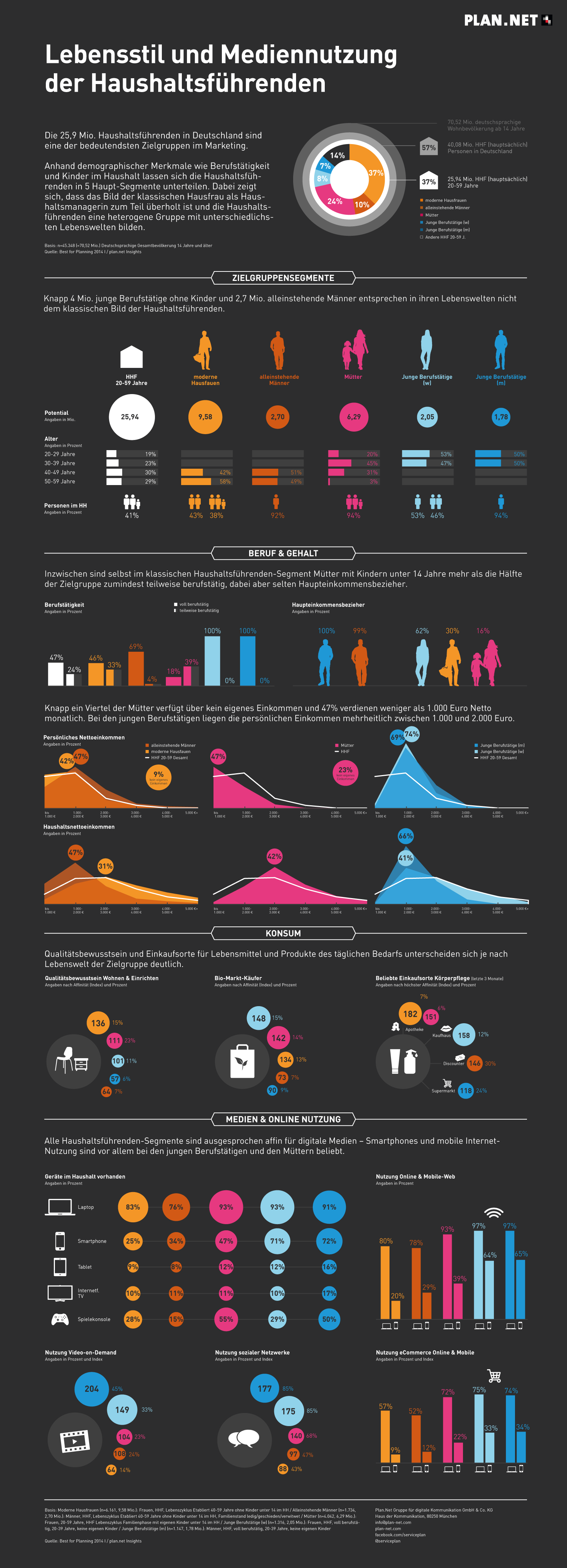Fast 26 Millionen Haushaltsführende im Alter zwischen 20 und 59 Jahren gibt es in Deutschland – nicht umsonst sind sie eine der bedeutendsten Zielgruppen für werbetreibende Unternehmen. Allerdings ist noch großes Potential bei der exakten Ansprache der Zielgruppe vorhanden, wie eine aktuelle Analyse der Plan.Net Gruppe belegt. Denn Haushaltsführende sind eine heterogene Gruppe, was Lebensstil, Konsumverhalten und Mediennutzung betrifft. Fünf Segmente hat Plan.Net identifiziert.
