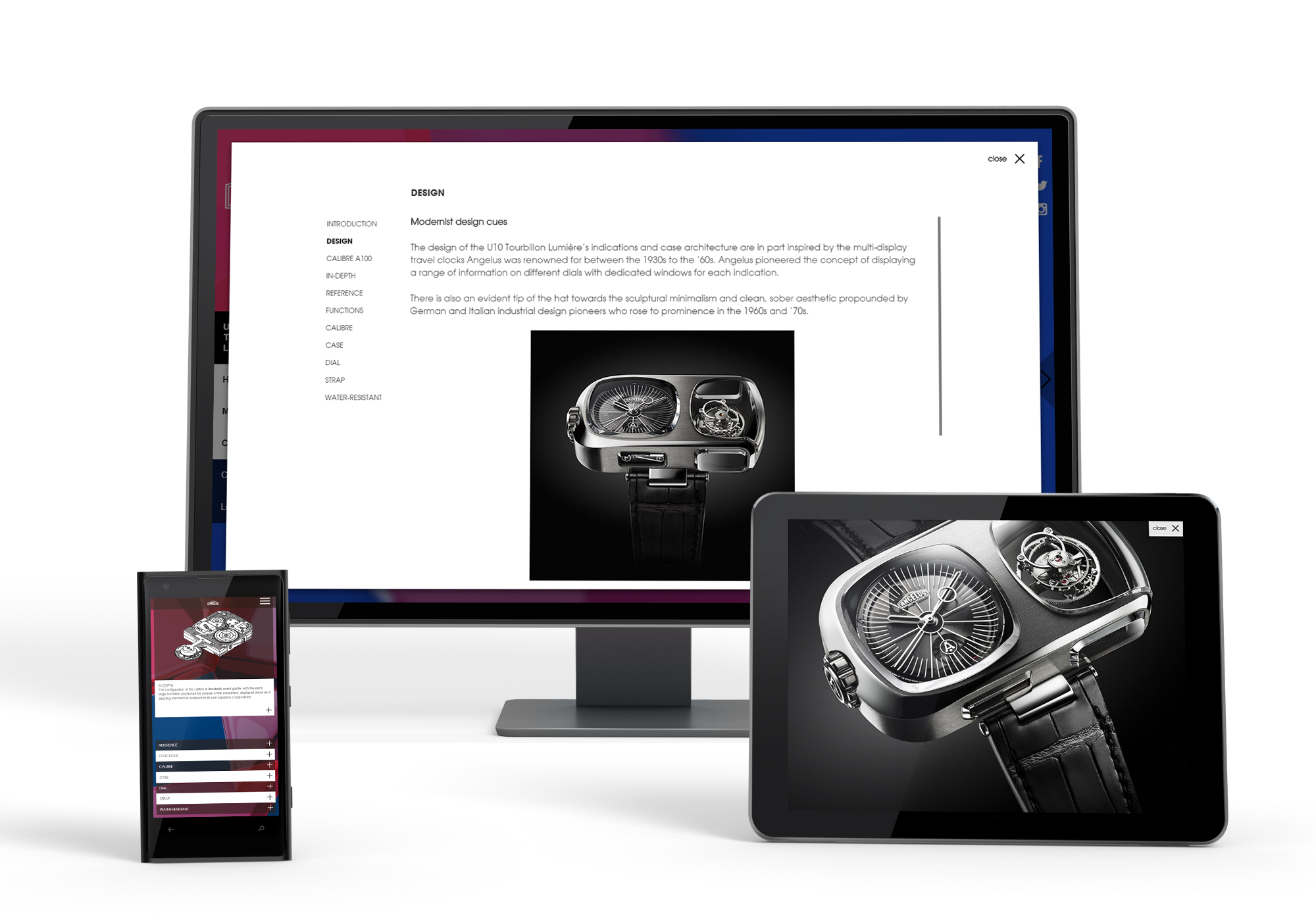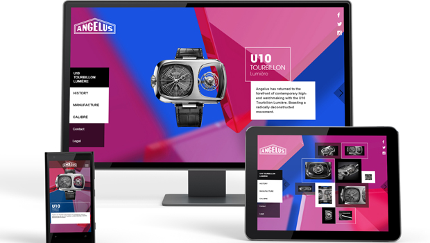 Skulptural, leuchtend, high-tech: So wie die Uhr, so auch die von Futurecom konzipierte Parallax-Site, welche mit ebendiesen Attributen spielt. Entstanden ist beispielsweise ein dreidimensionaler Raum, in der die «U10» mit dem übergrossen und separaten Tourbillon schwebt und in einer Bildstrecke von allen Facetten bewundert werden kann. Das gewagtere Farbenspiel, welches sich durch sämtliche Seiten zieht, steht für dieses Leuchtende, das die glattpolierte Stahloberfläche wiedergibt. Und die Galerie verbindet wiederum die Art-Deco-Heritage mit dem neuen High-Tech-Zeitgeist von Angelus.