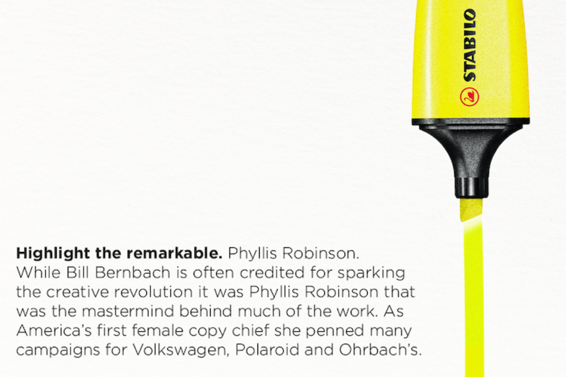 Als Erweiterung der preisgekrönten Kampagne „Highlight the Remarkable“ von Stabilo Boss und DDB Germany hebt DDB Phyllis, ihr Vermächtnis und ihren bahnbrechenden Geist hervor, der heute in allen Mitarbeitern weiterlebt.