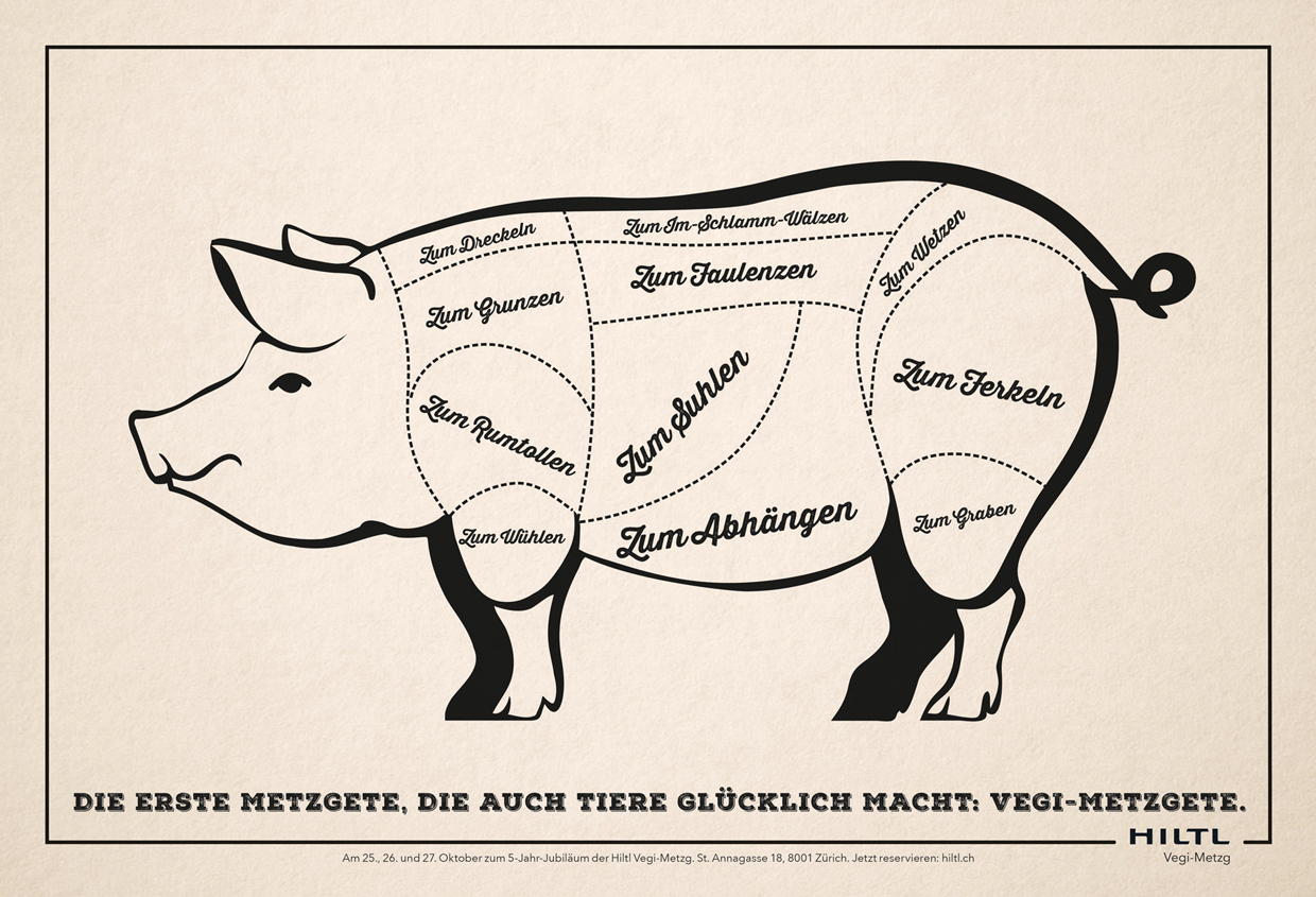 Das grosse Schlemmen wird unter anderem begleitet von einer Kampagne von Ruf Lanz. Die Kreativen haben dafür typische Metzgertafeln überraschend umgedeutet. Da ist der Schenkel zum Rumhüpfen, der Rücken zum wohligen Wetzen und das Hinterteil zum Ferkeln. Denn dank der Hiltl Vegi-Metzgete können sich Schwein und Kalb weiterhin lustvoll des Lebens erfreuen.