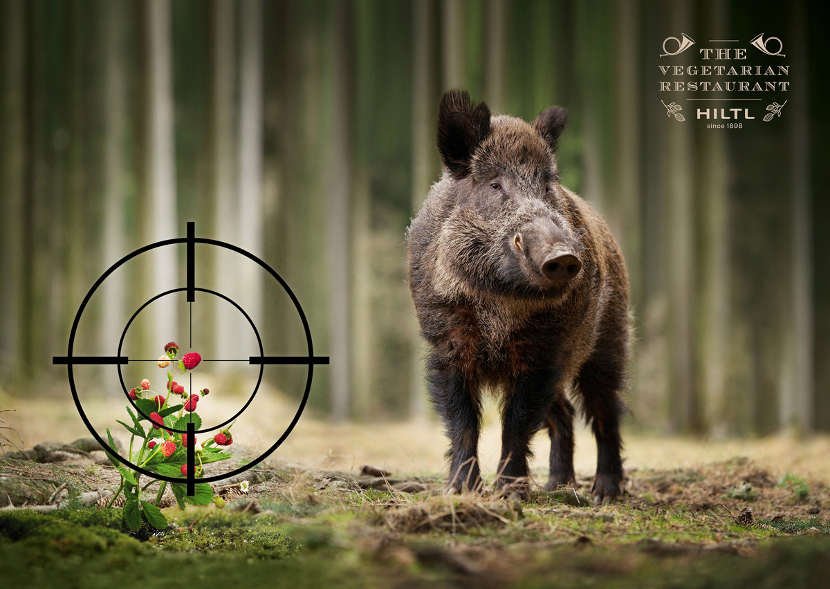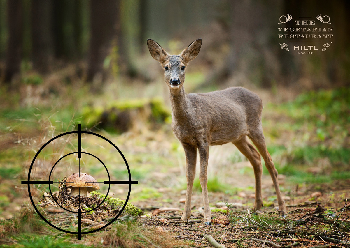 Die aktuelle Kampagne während der Jagdsaison bringt die Haltung auf den Punkt, die alle Hiltl-Angebote verbindet: Der Genuss geht nie auf Kosten anderer Lebewesen. Dies wird demonstriert anhand von typischen Jagdszenen, bei denen das Visier nicht auf das Tier gerichtet ist – sondern auf appetitliche Salate, Früchte, Obst oder Speisepilze in ihrem Umfeld. So gelingt es, in einem Bild beides zu vereinen: das, was bei Hiltl frisch auf den Tisch kommt. Und das, was bei Hiltl verschont bleibt.