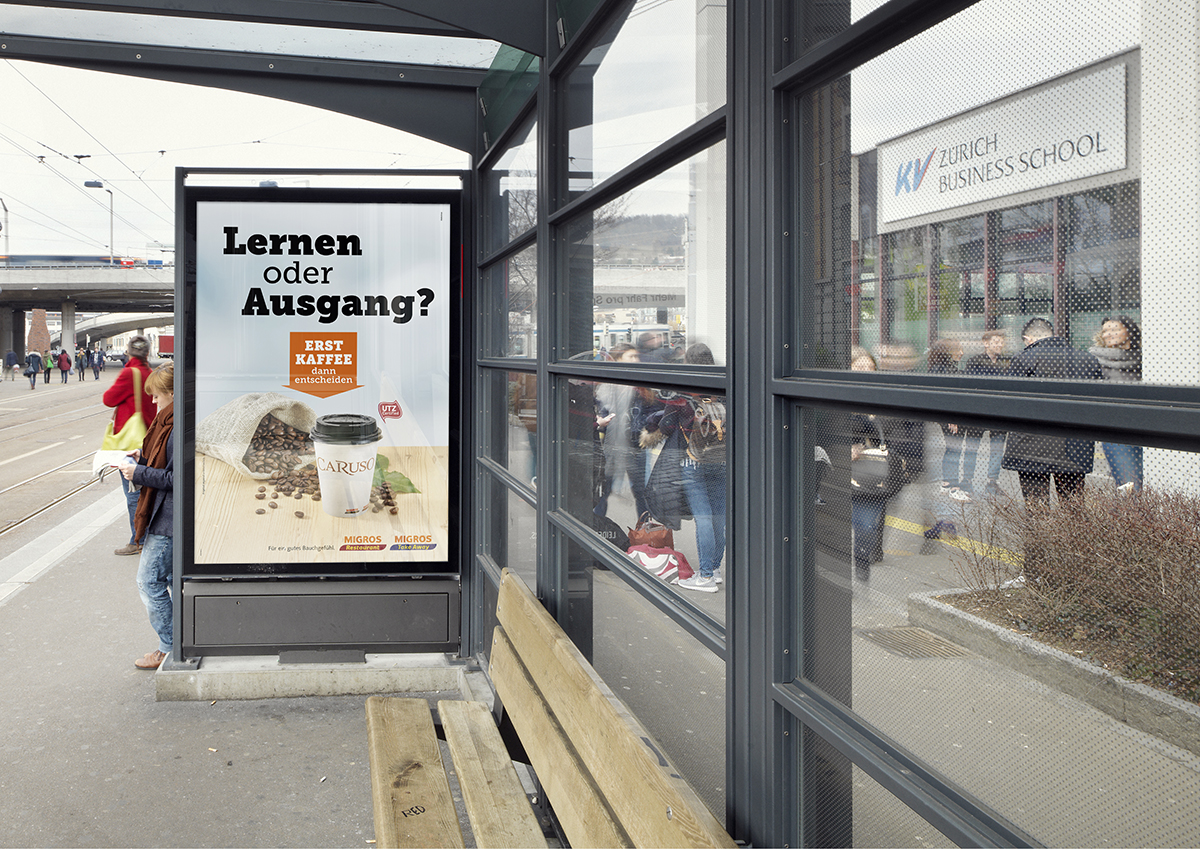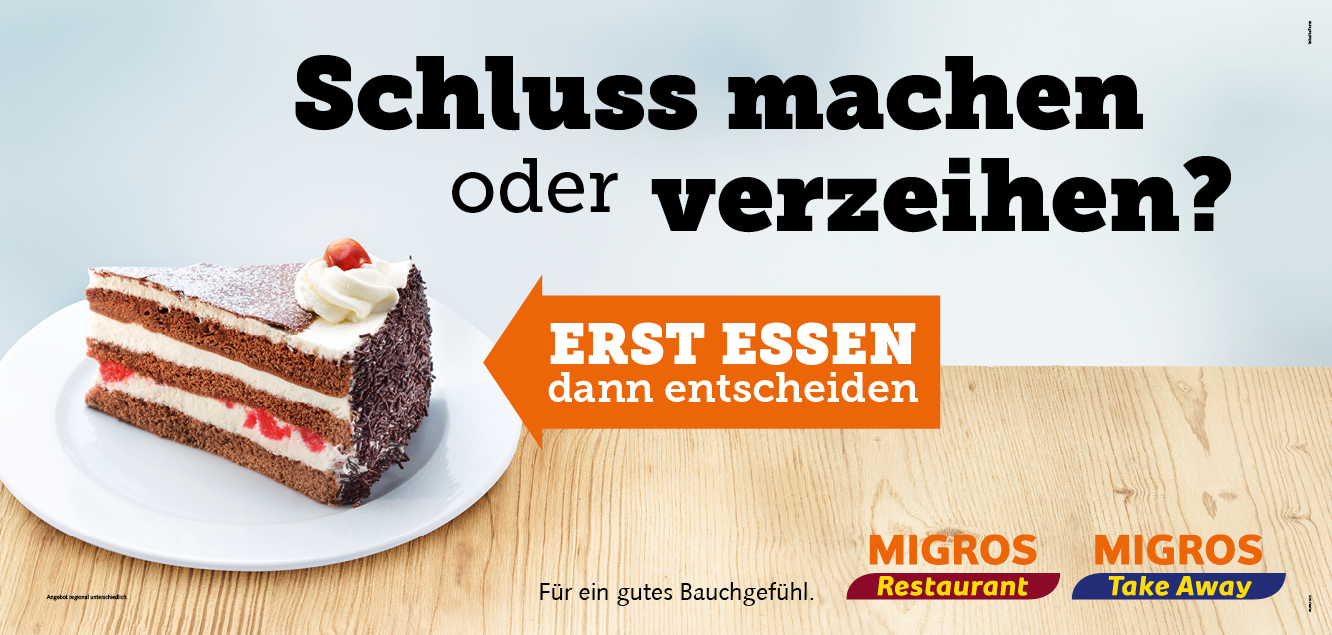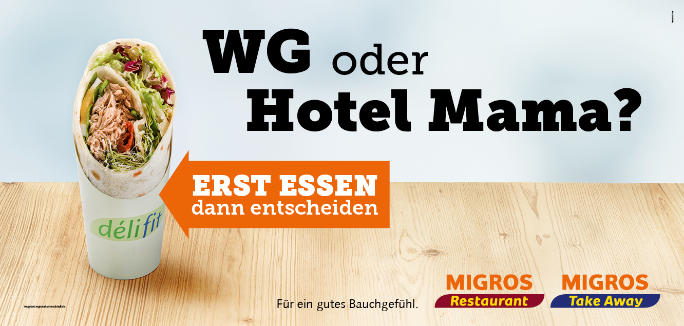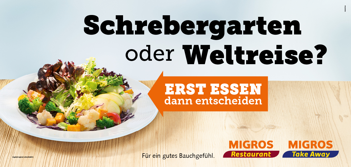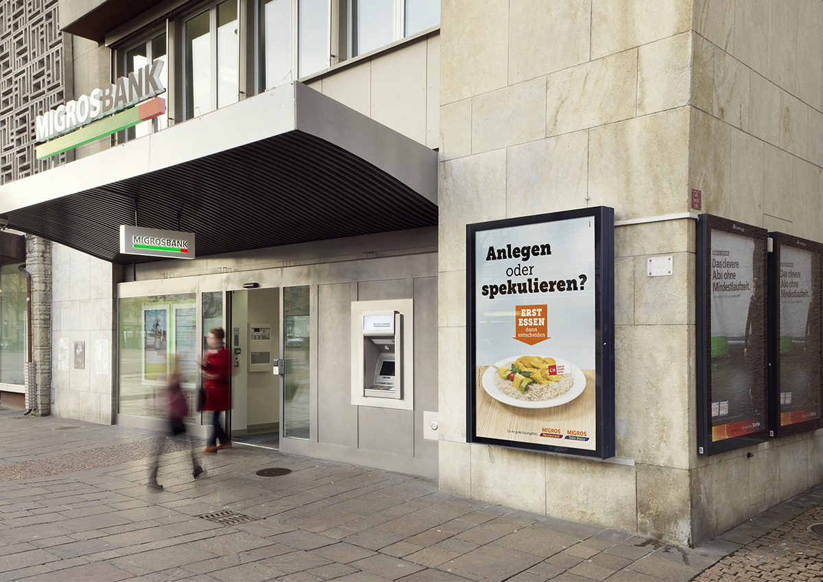 Rund 550 Plakatstellen werden mit Sujets bespielt, die oft einen standortspezifischen Bezug herstellen. So werden Passanten vor der Migros-Bank in Zürich-Oerlikon mit der Frage «Anlegen oder spekulieren?» konfrontiert. Die Absender Migros-Restaurants und Migros-Take-Away raten: «Erst essen, dann entscheiden. Für ein gutes Bauchgefühl.» Denn bei der Migros Gastronomie kann darauf vertraut werden, dass Werte wie Herkunft, Frische und Preis-Leistungs-Verhältnis stimmen. Das gibt ein gutes Bauchgefühl, welches die Entscheidungsfindung erleichtert.