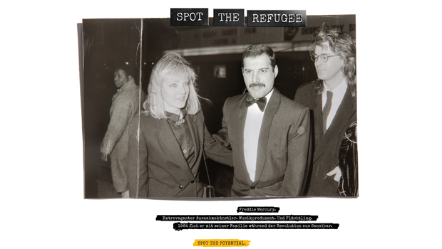 Die Kampagne schafft diese Erkenntnis durch eine Art Suchbild. Unter der Überschrift „Spot the refugee“ rufen die Motive dazu auf, den Geflüchteten in einer Gruppe von Menschen zu erkennen. Dass es ausgerechnet die prominente Persönlichkeit ist, wird im klein gedruckten Text unter dem Bild aufgelöst. Einstein und Dietrich, die vor den Nazis flohen, Mercury, der einer kriegerischen Revolution in Sansibar entging.