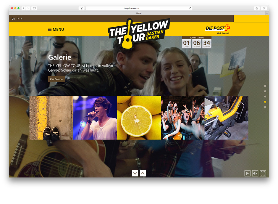 Auf der dreisprachigen Seite TheYellowTour.ch können Fans fast in Echtzeit mitverfolgen, wie Baker seine Tour mit Hilfe der Angebote der Post erlebt. Und sie erfahren auch mehr über die Dienstleistungen und wie sie diese selber nutzen können. Natürlich können sie auch Konzerttickets kaufen oder via Wettbewerb gewinnen sowie das Konzert in Zürich im Livestream mit anschauen.