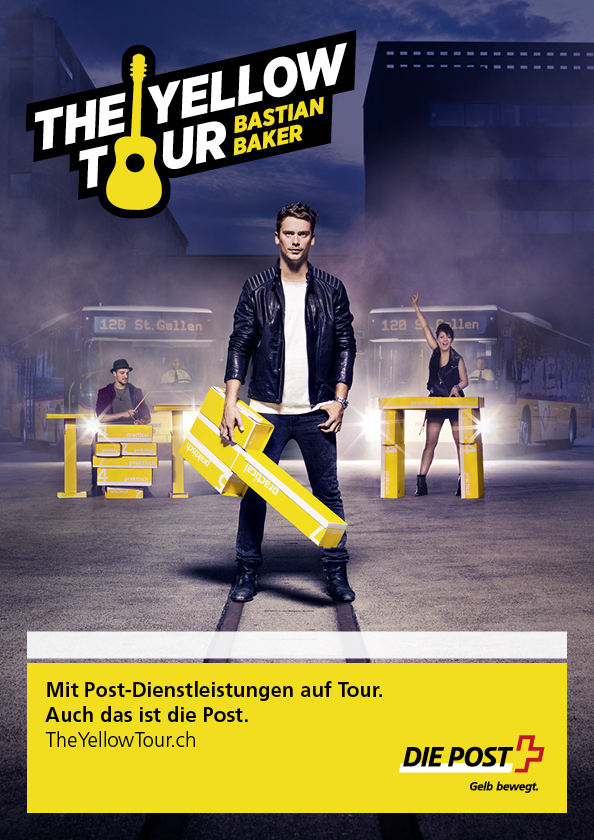 Um die Vorteile dieser neuen Services an der Schnittstelle zwischen digitaler und physischer Welt erlebbar zu machen, startet die Post heute mit der von Jung von Matt/Limmat konzipierten Kampagne THE YELLOW TOUR. Eine Kampagne, die ganz konkret aufzeigt, wie einfach, orts- und zeitunabhängig Post-Dienstleistungen heutzutage sind: Der Schweizer Sänger und Songwriter Bastian Baker beweist dies auf der eigens ins Leben gerufenen THE YELLOW TOUR der Post.