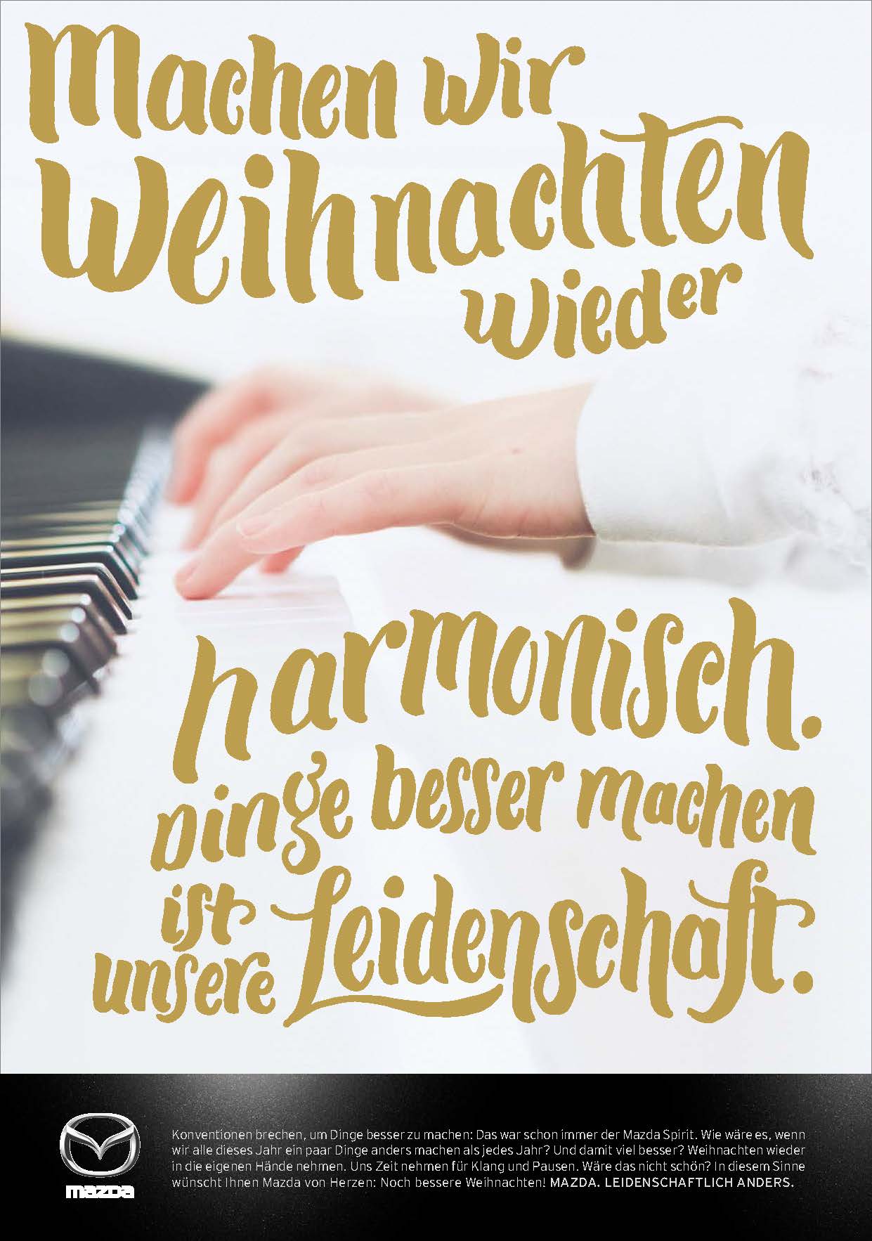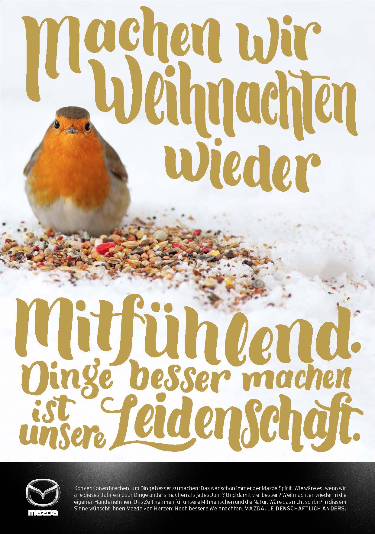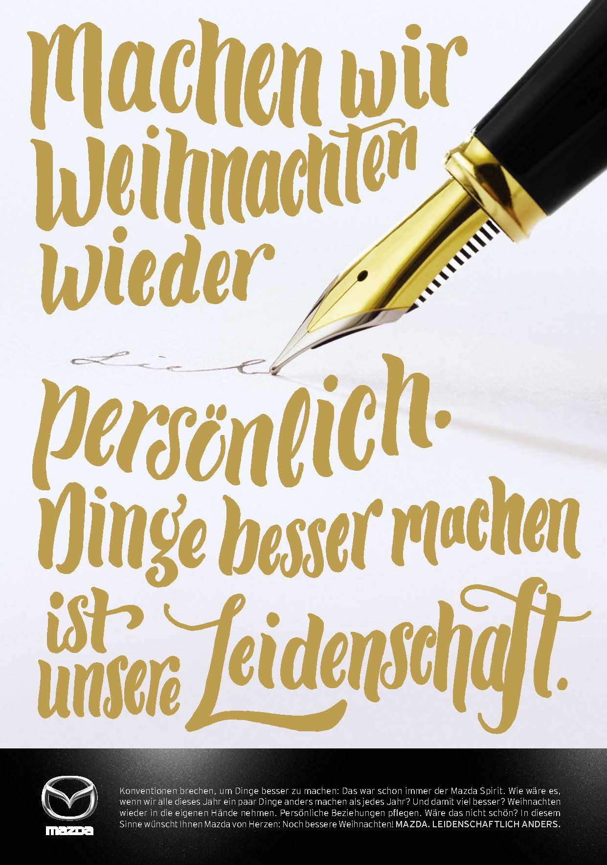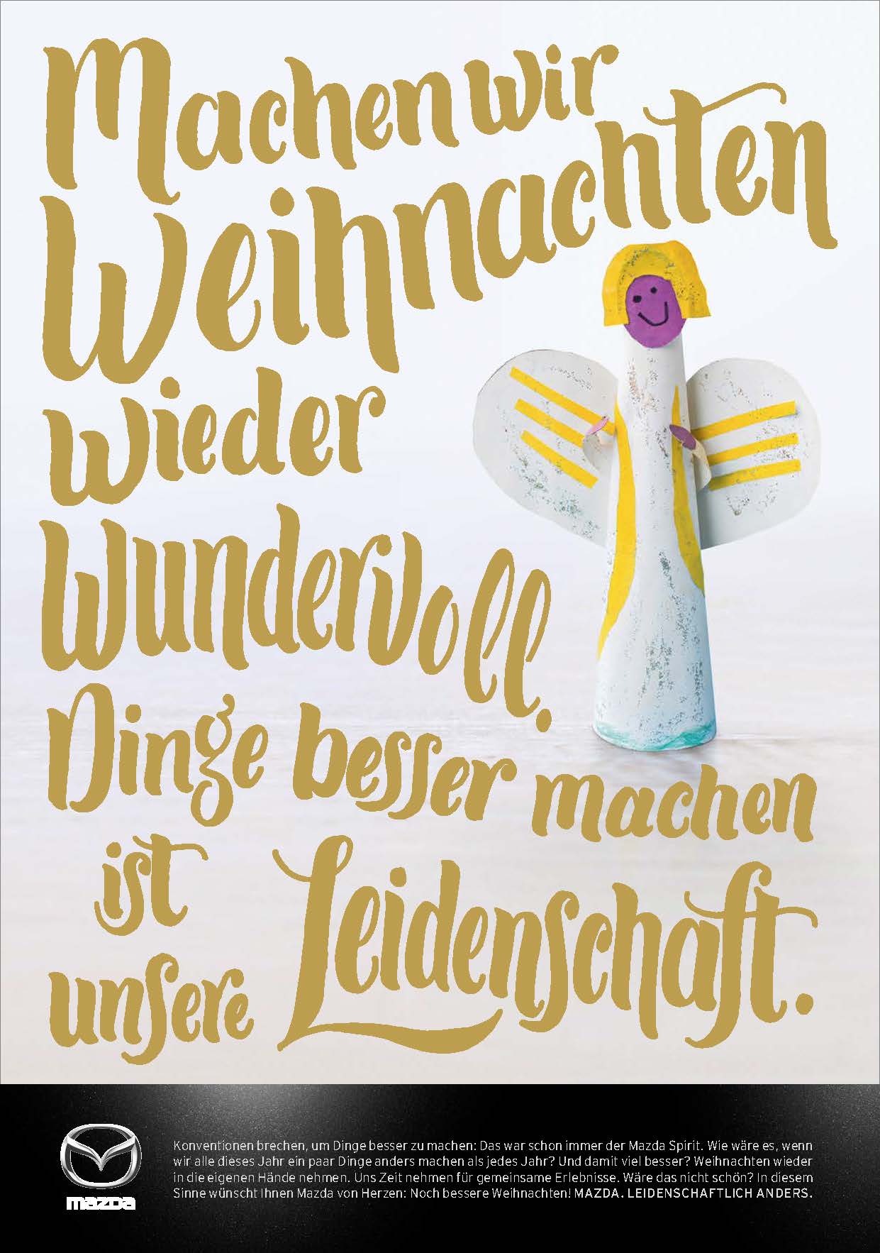 Konventionen brechen, um Dinge besser zu machen: Das war schon immer der Mazda-Spirit. Ausgehend von dieser einzigartigen Brand Attitude schenkt Mazda der Schweiz eine weihnachtliche Markenkampagne, in der kein einziges Auto vorkommt. Im oberflächlichen Weihnachtsrummel will die Marke Mazda einen Kontrapunkt setzen, indem sie die Menschen anregt, Weihnachten wieder in die eigenen Hände zu nehmen. Sich Zeit zu nehmen für die eigentlichen Werte von Weihnachten. Damit bricht Mazda mit klassischen Weihnachts-Konventionen. Und hilft mit, Weihnachten für alle noch besser zu machen.
