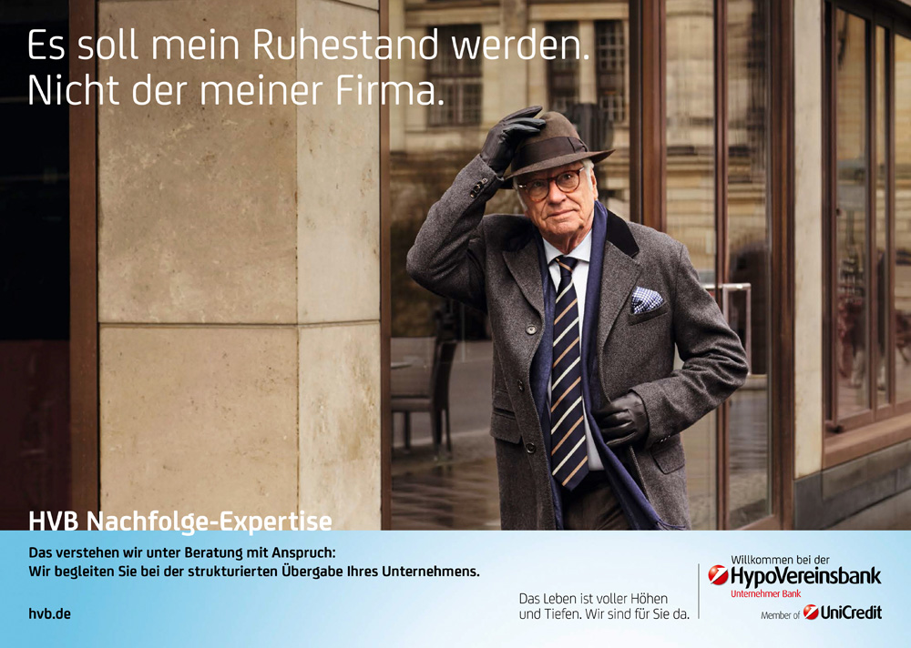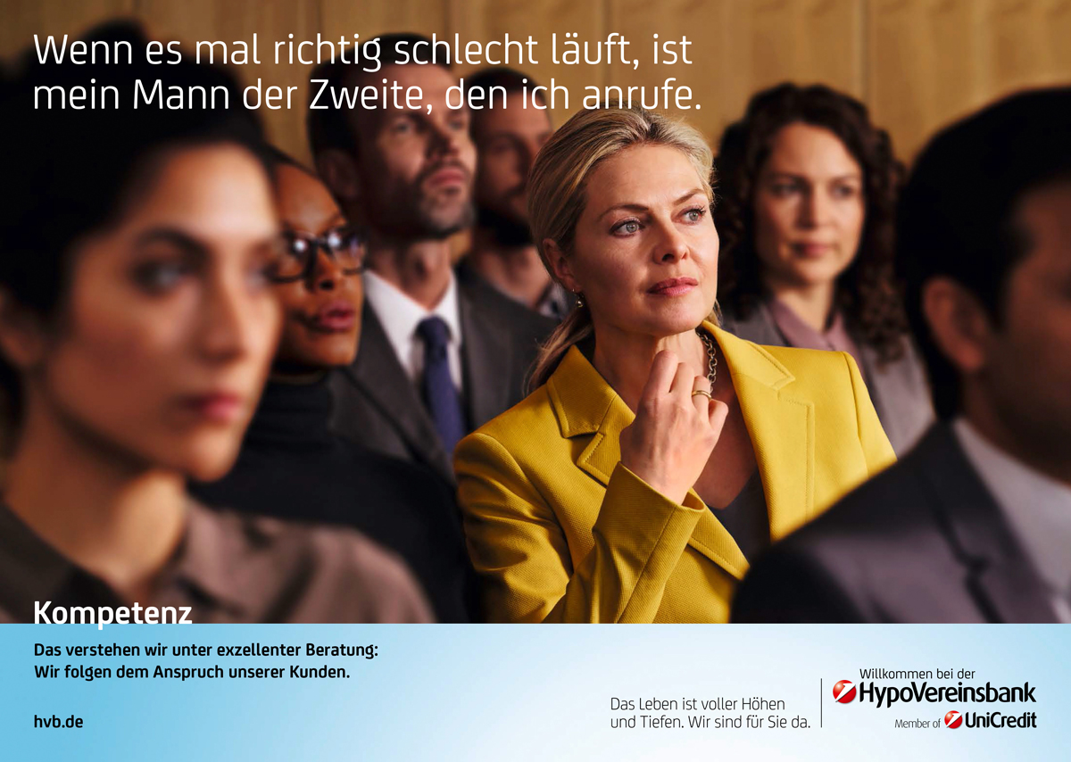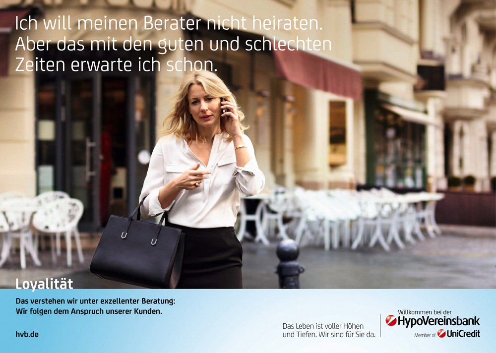Die zielgruppenspezifische Kommunikation legt den Schwerpunkt auf Online-, Out-of-Homeund Print-Massnahmen, insbesondere an Flughäfen und in Wirtschaftstiteln mit entsprechenden Specials. In fünf Haltungsmotiven werden die Kernwerte – Loyalität, Geradlinigkeit, Charakter, Engagement und Kompetenz – die die Beratungsqualität der HypoVereinsbank auszeichnet, kommuniziert. Weitere Produktmotive stellen die Kernprodukte der HypoVereinsbank im Private Banking und der Unternehmer Bank in den Mittelpunkt.