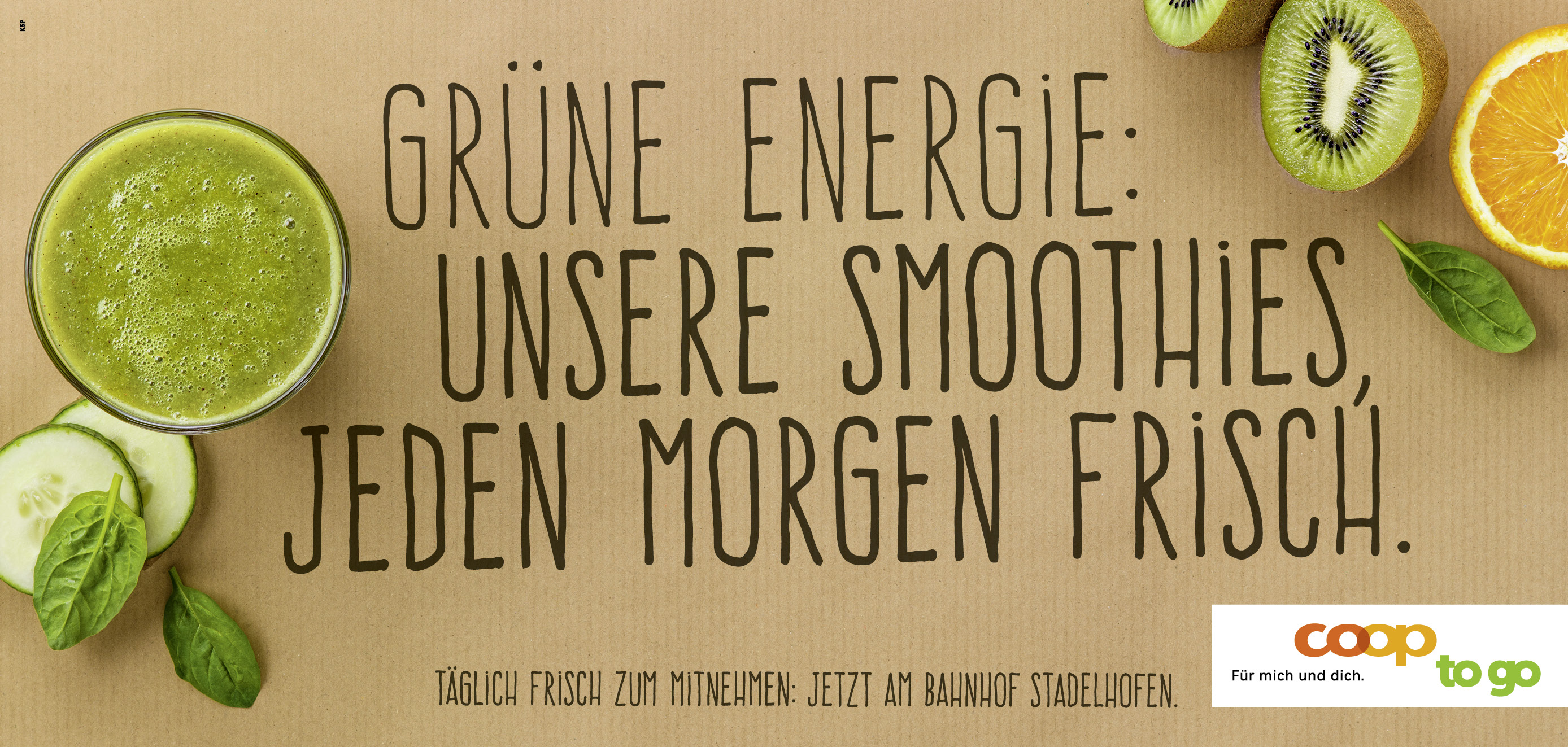 Zur Lancierung der ersten Filiale im Bahnhof Stadelhofen Zürich hat KSP das Eröffnungskonzept erarbeitet. Im Mittelpunkt stehen originelle Headlines im Handschriften-Look und appetitlich arrangierte Food-Bilder von Müesli, Paninis, Salaten, Smoothies und Brot auf einem Packpapierhintergrund. Sie transportieren die beiden Hauptbotschaften Frische und Individualität und machen Lust auf mehr.