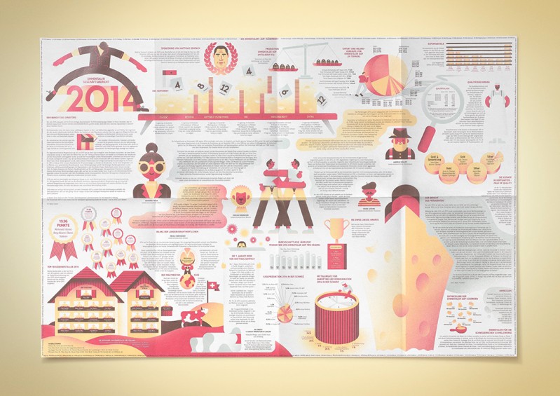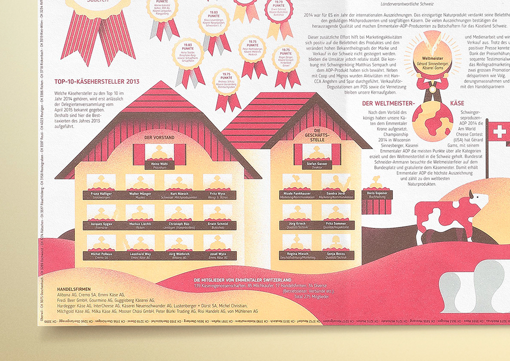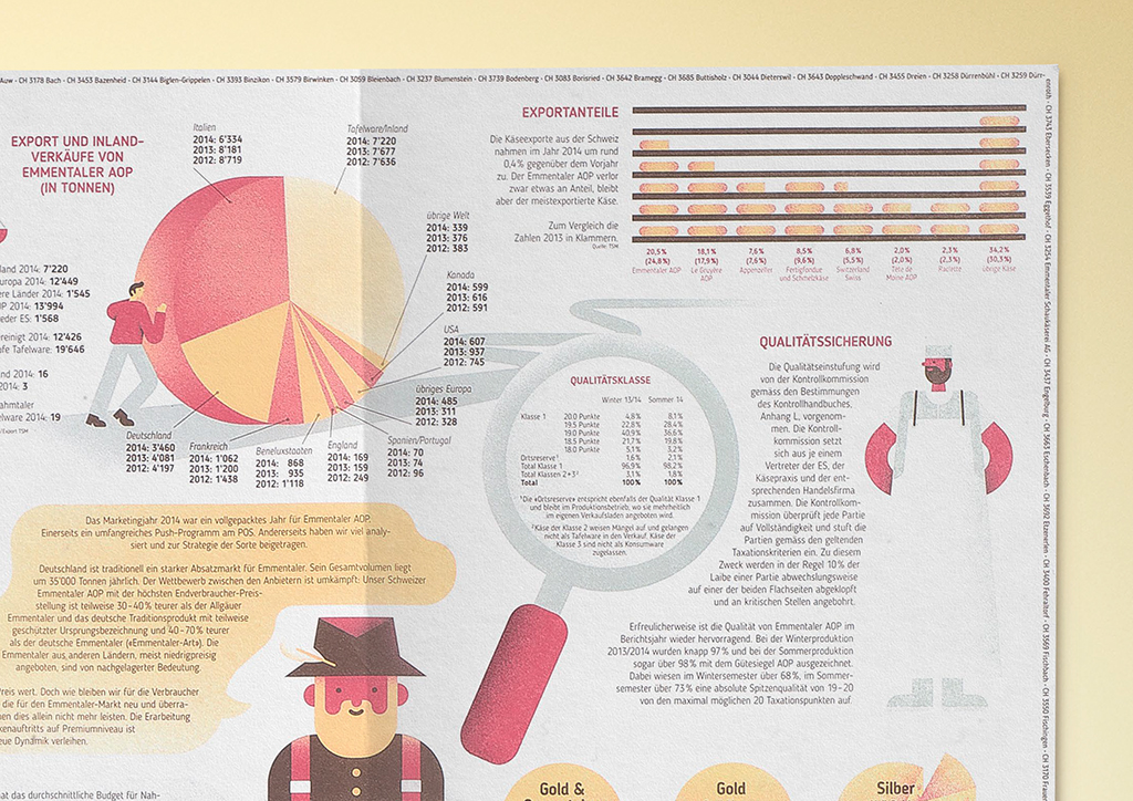 Emmentaler Switzerland hat Leo Burnett beauftragt, den Geschäftsbericht für das Geschäftsjahr 2014 zu kreieren. Als Informationsträger dient etwas, das mit Emmentaler Switzerland untrennbar verbunden ist: ein Käsepapier. Für den 98,5 x 66 cm grossen Bogen wurden sämtliche Berichte und Unternehmenszahlen illustrativ interpretiert. Der renommierte Schweizer Illustrator Philipp Dornbierer stellte die verschiedenen Eigenheiten der Marke Emmentaler fantasievoll dar: Das Firmenorganigramm hat die Form eines traditionellen Emmentaler Hauses, ein grosser Käsebottich informiert über den Mediamix des Marketings und ein ikonisches Käseschiff versinnbildlicht Emmentaler Switzerland als Flaggschiff der Schweizer Käsesorten.