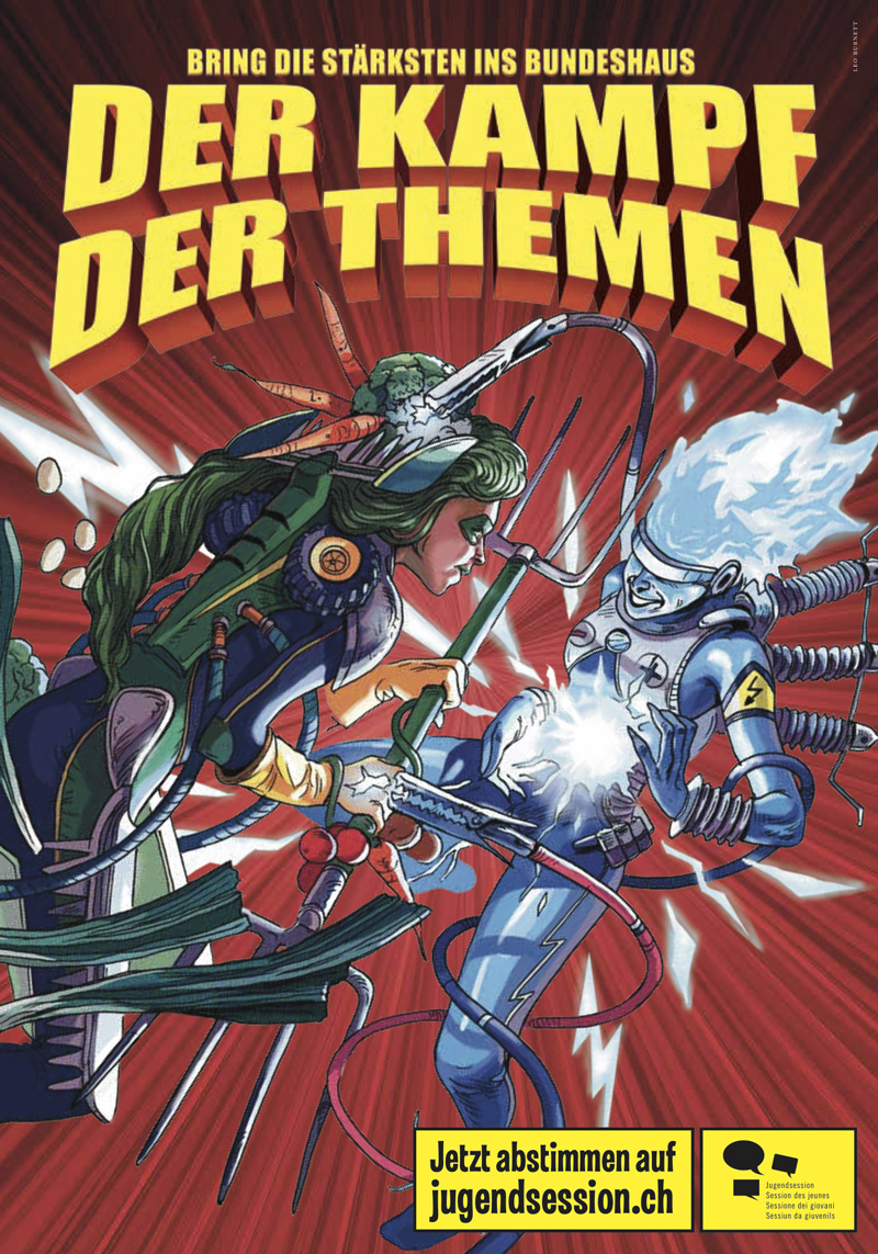 Leo Burnett Schweiz: Jugendsession ruft zum Kampf der Themen. Einmal im Jahr diskutiert die Jugend im Bundeshaus über Politik. Und worüber diskutiert wird, bestimmt sie auch – beim Themen-Voting auf jugendsession.ch. Für die nötige Aufmerksamkeit sorgen aktuell drei Sujets von Leo Burnett Schweiz. Unter dem Motto «Der Kampf der Themen – Bring die Stärksten ins Bundeshaus» zeigen in der Bildsprache klassischer Superhelden-Comics immer zwei der zur Wahl stehenden Themen im Kampf miteinander. So kämpft in einem der Sujets Drogenpolitik gegen Lobbying. In einem anderen Waffenexporte gegen Organspende. Und im dritten Sujet Ernährung und Landwirtschaft gegen Stromnetz.