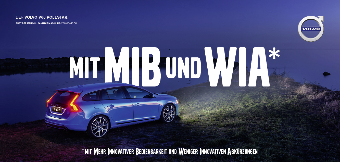 So verbirgt sich etwa hinter «Mit MIB und WIA*» nicht noch ein weiteres Assistenz- oder Multimediasystem, sondern die Antwort auf ein Bedürfnis, das vielen Autofahrern heutzutage aus dem Herzen sprechen dürfte: «Mit mehr innovativer Bedienbarkeit und weniger innovativen Abkürzungen». Insgesamt laden fünf Sujets zum Entdecken der Markenphilosphie von Volvo ein.
