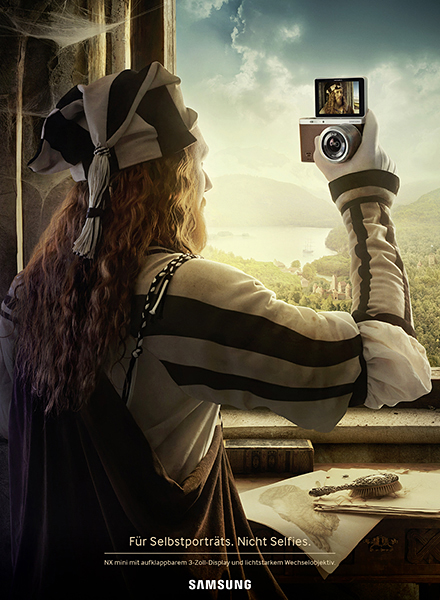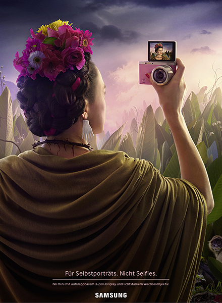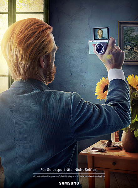 Leo Burnett Schweiz verwandelte den USP in eine meisterhafte Print-Kampagne, die international eingesetzt wird. Albrecht Dürer, Vincent van Gogh und Frida Kahlo sind darauf nicht nur in der Pose zu sehen, die sie auf ihren berühmten Selbstporträts einnehmen. Wir dürfen auch den Akt des Porträtierens an sich beobachten – der Blick in die NX mini, die am langen Arm gehalten wird. Die wie gemalt erscheinenden Bilder wurden ausschliesslich mit fotografischen Mitteln realisiert.