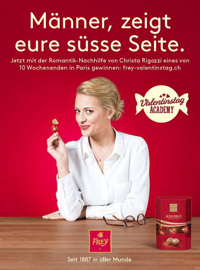 Zumindest einmal im Jahr sollten Männer ihre süsse Seite zeigen. Und zwar am Valentinstag. Und damit das nicht in einem Desaster endet, zeigen Chocolat Frey und Christa Rigozzi den Männern, wie das richtig geht: In der Adoro Valentinstag-Academy. Auf der Website frey-valentinstag.ch kann man mit Christa Rigozzi üben, wie man richtig Komplimente macht, aufmerksam zuhört oder das richtige Geschenk auswählt. Unter den Teilnehmern werden unter Anderem 10 romantische Wochenenden in Paris verlost.