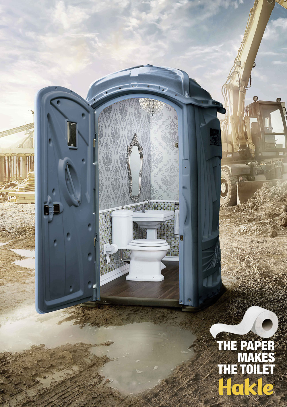 Die Grundidee der Kampagne mit drei Plakatmotiven leitet sich aus einem ebenso einfachen wie treffenden Insight ab: In manchen Fällen ist beim Besuch einer Toilette das vorhandene Papier wichtiger als die Toilette selbst. Die Visuals zeigen eine maximale Überhöhung dieser Tatsache. Was von außen wie ein einfaches und sehr schmutziges Not-Örtchen aussieht, wird mit Hakle Toilettenpapier zu einem super-sauberen und luxuriösen Wohlfühlort. Die Tagline fasst entsprechend simpel zusammen: «Das Papier macht die Toilette.»