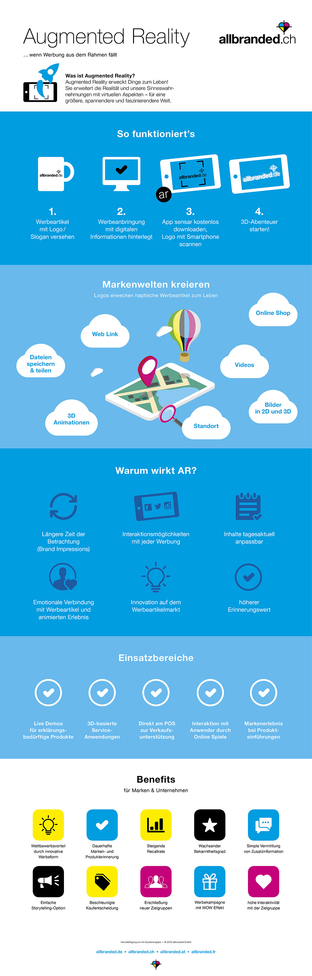 Dabei kann sich hinter dem Logo so gut wie alles verbergen: Ob Video, Link zum Online Shop oder 2D- und 3D-Bilder. Beliebt sind auch ganze 3D-Animationen, die eine Markenwelt öffnen, Interaktionen ermöglichen und Storytelling erleichtern. Als Beispiel kann das Testimonial der Firma beim Scan des Logos erscheinen und Produktinformationen geben oder aber auf eine besondere Sales Aktion hinweisen. Gleichsam kann das Logo auch mit speziell aufbereiteten Bedienungsanleitungen verknüpft sein. Dieses Nutzererlebnis ist nicht nur praktisch für die Zielgruppe, sondern bleibt auch nachhaltig in Erinnerung. Augmented Reality kann durch diesen überraschenden WOW Effekt die Werbewirkungen der Werbeartikel noch erhöhen.