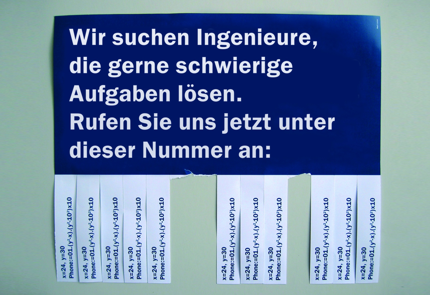 Um die Rekrutierung von Hochschulabsolventen. McKinsey wollte nicht mehr Bewerber, sondern weniger – dafür die besten. Also liessen wir das Logo weg und verschlüsselten die Telefonnummern als mathematische Formeln, so dass sie nur mit entsprechender Qualifikation zu knacken waren. Dadurch sparte sich McKinsey viel Zeit für das Auswahlverfahren. Und ungeeigneten Kandidaten wurde gleich noch der Frust einer Absage erspart.