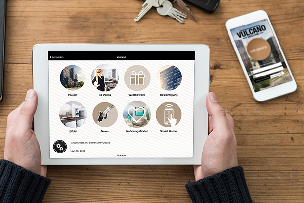 Mit dem Herunterladen der VULCANO-App haben die Interessenten alles vor Augen: das Projekt, die visualisierten Wohnungen, 3D-Panoramabilder, die Smarthome-Technologie, und Wettbewerbe – und als Wichtigstes ein intuitiver Wohnungsfinder mit laufenden Updates über die Verfügbarkeit und sofortiger Reservations- oder Kontaktmöglichkeit.