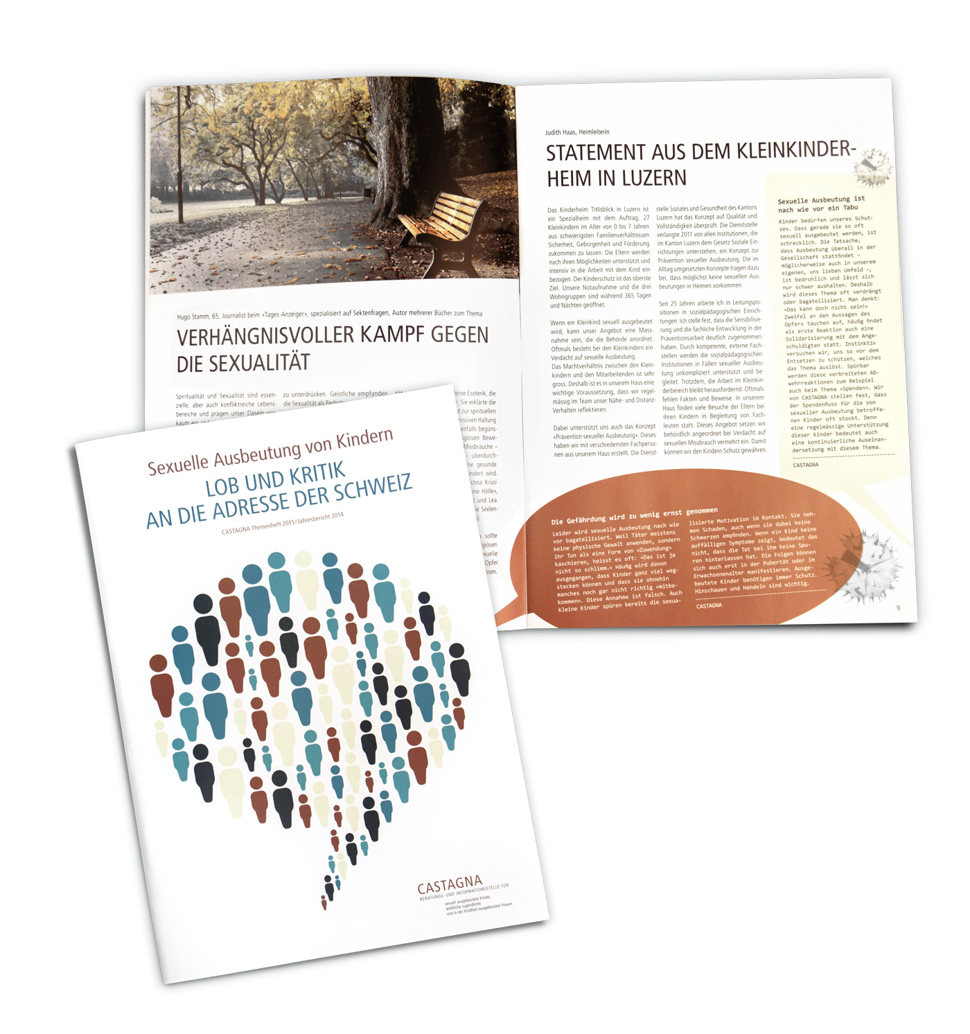 Um für das tabubehaftete Thema der sexuellen Ausbeutung zu sensibilisieren, hat OgilvyOne Anfang 2015 bereits zum achten Mal in Folge das jährlich erscheinende Themenheft gestaltet. Unter dem Titel «Sexuelle Ausbeutung von Kindern ­­– Lob und Kritik an die Adresse der Schweiz» ist so eine eindrückliche und gleichzeitig erschütternde Bestandsaufnahme entstanden. Die Beiträge von CASTAGNA, von Betroffenen, Fachleuten und Politikerinnen zeichnen das Bild einer Gesellschaft, in der Opfer traurigerweise immer noch viel zu oft alleine gelassen werden.