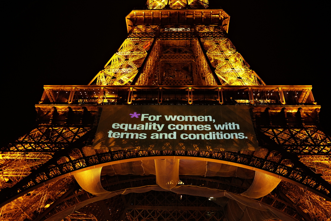 Die Kampagne übernahm mit einer Out-of-Home-Initiative das Stadtbild und machte die lange Liste an Bedingungen sichtbar, die Frauen im Laufe ihres Lebens hinnehmen müssen. Und am 8. März wurden die Lichter des bekanntesten Wahrzeichens von Paris – des Eiffelturm – ausgeschaltet, um das aktualisierte französische Motto zu zeigen: Liberté. Égalité*. Fraternité.
