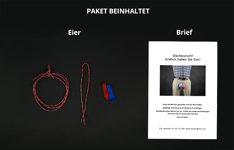 Donate Balls verschickt Eier an Leute, die keine haben. Man kann Eierberdürftigen anonym Eier spenden. Die Idee entstand aufgrund persönlicher Erfahrungen mit Spassbremsen, welche ihre Eier zusammen mit der Nabelschnur im Geburtssaal zurückgelassen haben, sich aber grosskotzig als Macher geben.