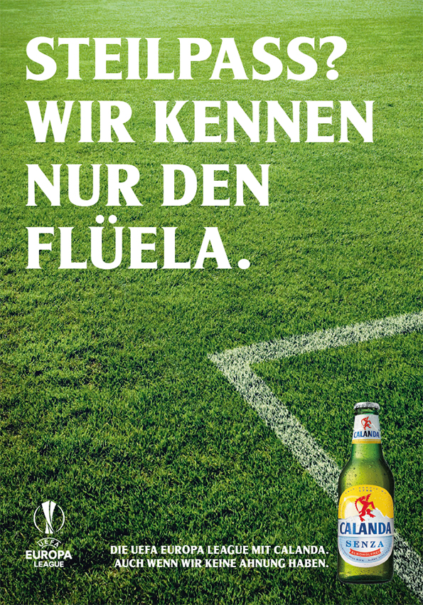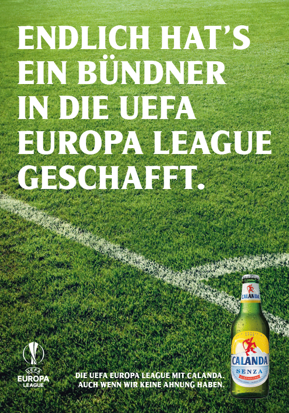 Seit der laufenden Saison ist das Bündner Traditionsbier offizieller Sponsor der UEFA Europa League in der Schweiz. Und obwohl Fussball und Bier normalerweise zueinander passen wie Hopfen und Malz, hat weder Calanda noch das Bündnerland etwas mit Fussball am Hut. Dieses vermeintliche Defizit wandelt Publicis nun geschickt in einen Vorteil um.