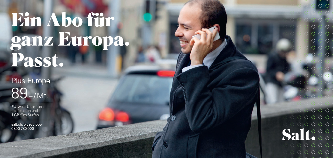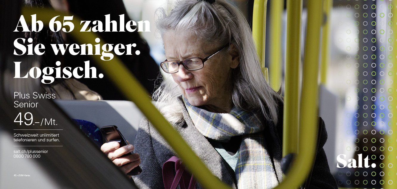 Salt hat neue Abos: Eins für Senioren. Eins für junge Leute unter 30. Eins für die Schweiz. Eins für Europa. Und alle sind sehr günstig. Publicis hat die neue Kampagne dazu gemacht. That’s it.