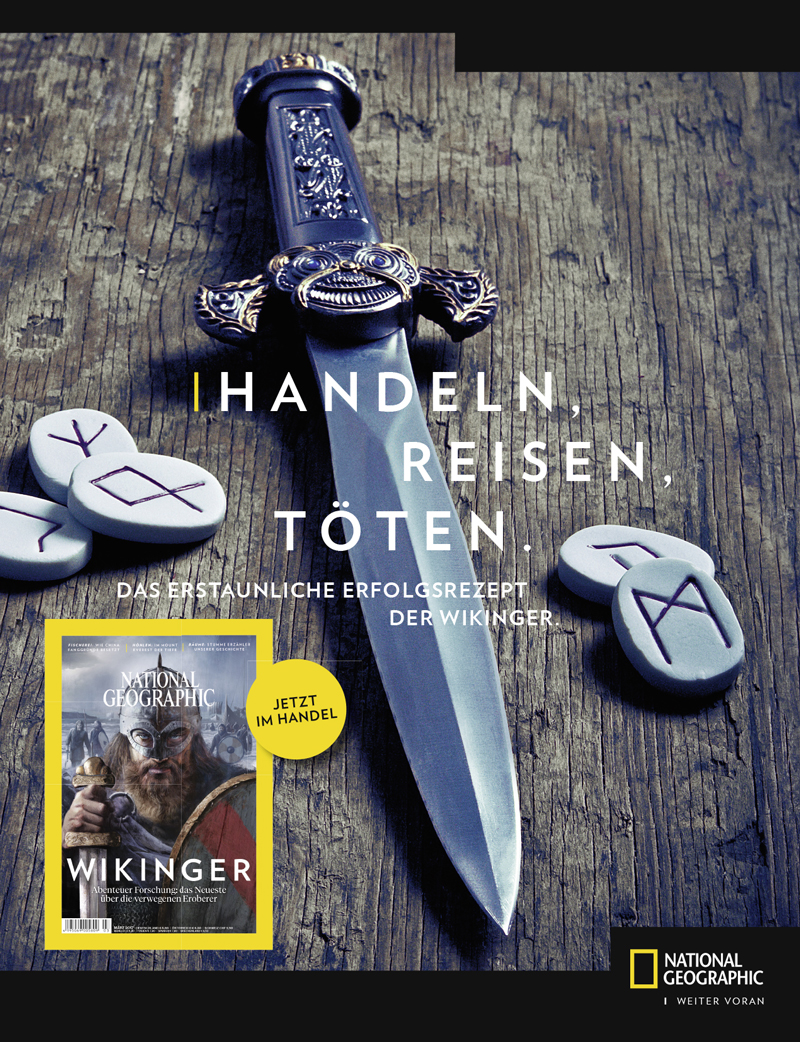 Seit Donnerstag ist die Anzeige „Wikinger – handeln, reisen, töten“ des renommierten Magazins NATIONAL GEOGRAPHIC unter anderem im STERN zu sehen. Die Hamburger Kreativagentur Philipp und Keuntje entwickelte die kreative Idee nach stilistischen Vorgaben der Weltmarke NATIONAL GEOGRAPHIC. Die Anzeige „Wikinger“ ist das erste Motiv für den deutschen Markt, das PUK für das Magazin realisierte. Weitere werden folgen.