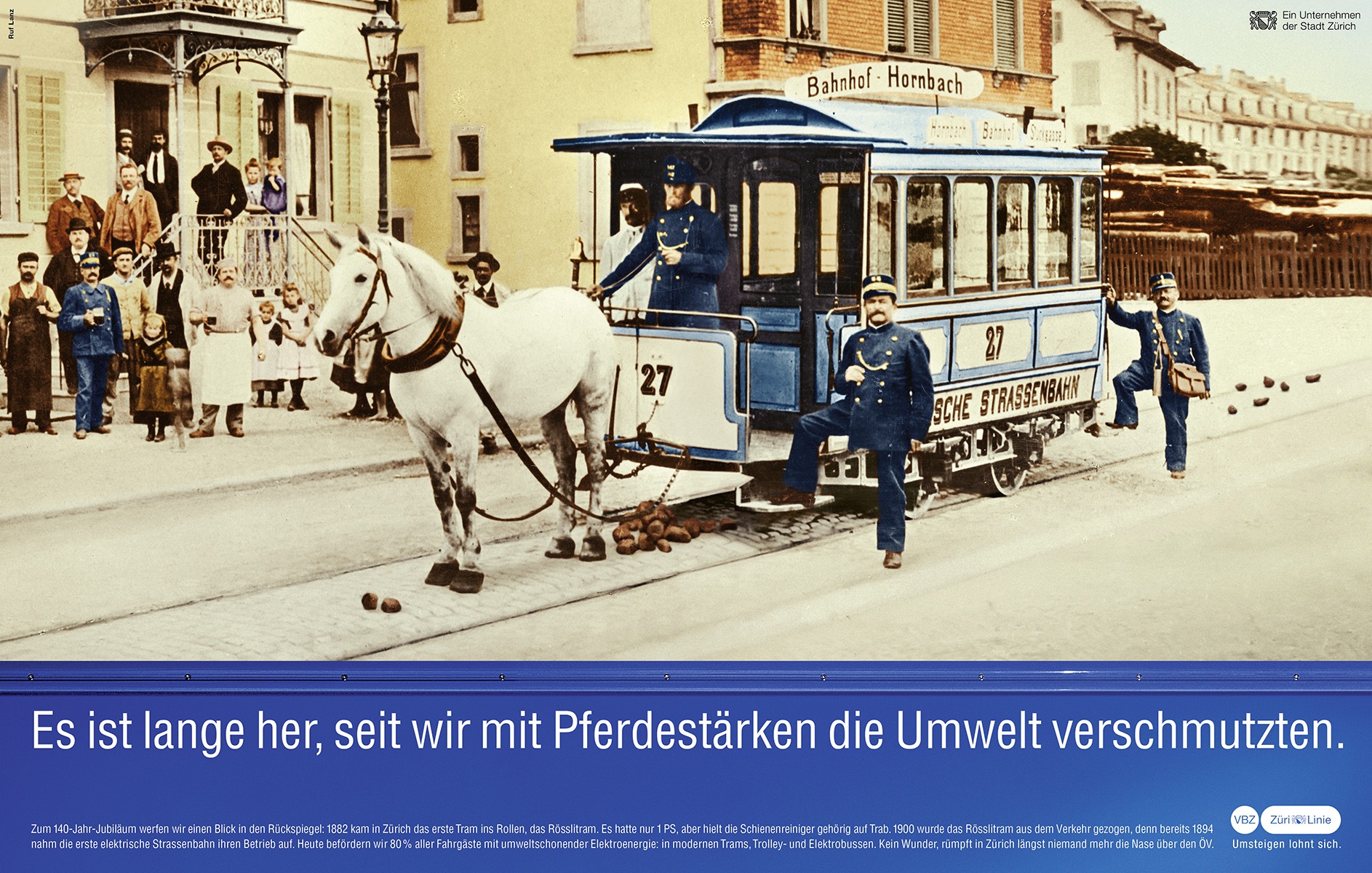 Zum Auftakt erscheint eine doppelseitige Textanzeige in bewusst klassischer Typografie, in der Ruf Lanz den Bogen spannt von den Anfängen bis zu den heutigen Flexity-Trams, Trolleybussen und Elektro-Quartierbussen, die im Gegensatz zum Rösslitram kaum noch Spuren in der Umwelt hinterlassen.