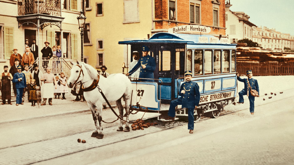 Im Jahr 1882 kam in Zürich das erste Tram ins Rollen. Das Rösslitram bot Platz für 24 Fahrgäste und hatte nur eine einzige Pferdestärke, welche die Schienenreiniger jedoch ordentlich auf Trab hielt. Im Innenraum besassen die Damen damals ein Vorsitzrecht. Die Männer standen ohnehin lieber auf den Aussenplattformen, denn dort durfte man rauchen.