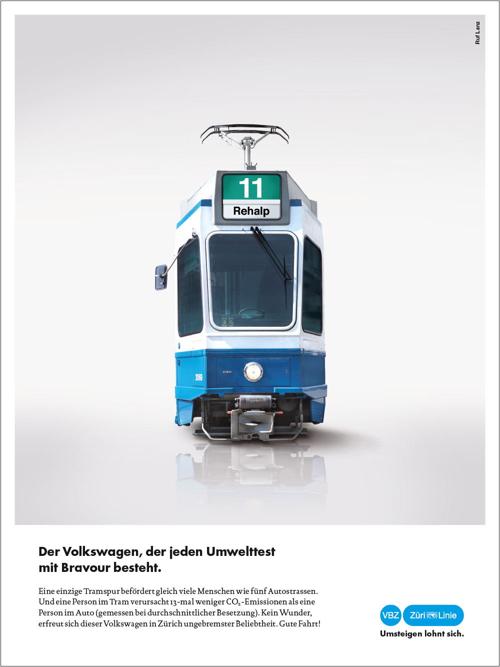 Der VW-Abgas-Skandal bewegt die Welt und die Medien. Vor diesem aktuellen Hintergrund zeigt die Kreativagentur Ruf Lanz, welcher Volkswagen strenge Umweltnormen wirklich erfüllt: das Tram. Denn eine einzige Tramspur befördert gleich viele Menschen wie fünf Autostrassen. Und eine Person im Tram verursacht 13-mal weniger CO2-Emissionen als eine Person im Auto (gemessen bei durchschnittlicher Besetzung).