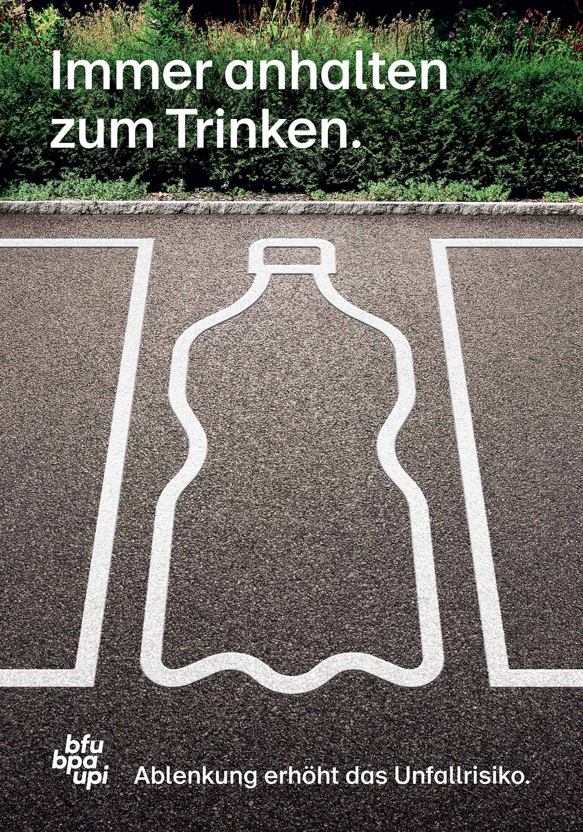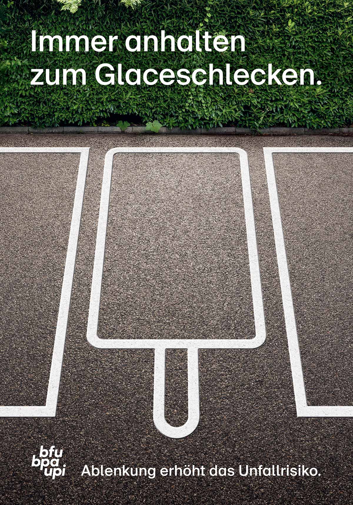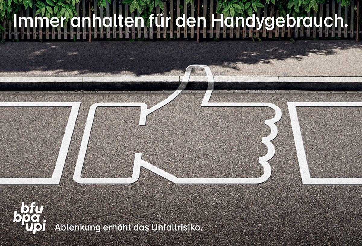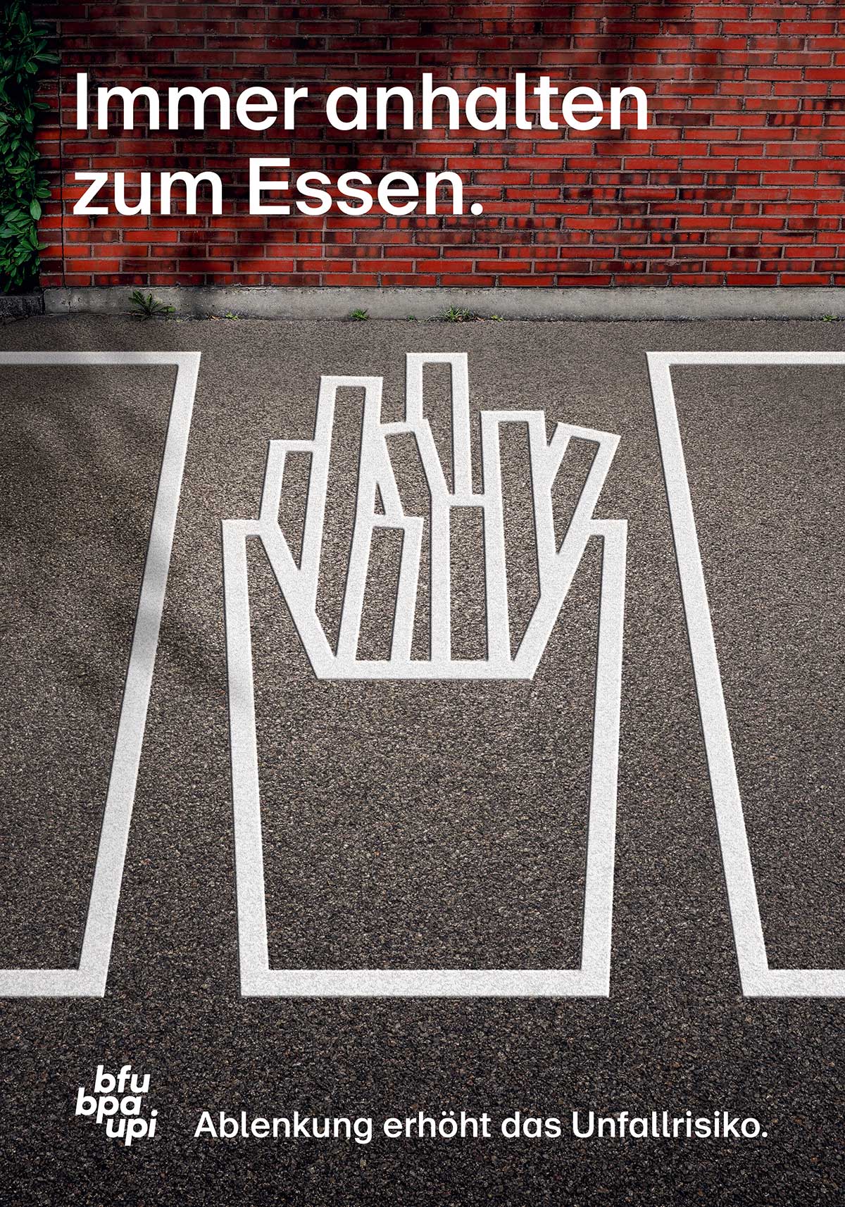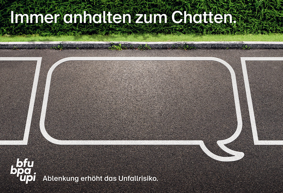 Dazu Jürg Beutler, Leiter Kommunikation bei der BFU: «Ruf Lanz hat uns zahlreiche kreative Vorschläge präsentiert. Gemeinsam fiel die Wahl auf das Konzept mit den ungewöhnlichen Parkfeldern. Denn es zeigt sehr plakativ und ohne Mahnfinger: Immer anhalten für Tätigkeiten, die einen ablenken».